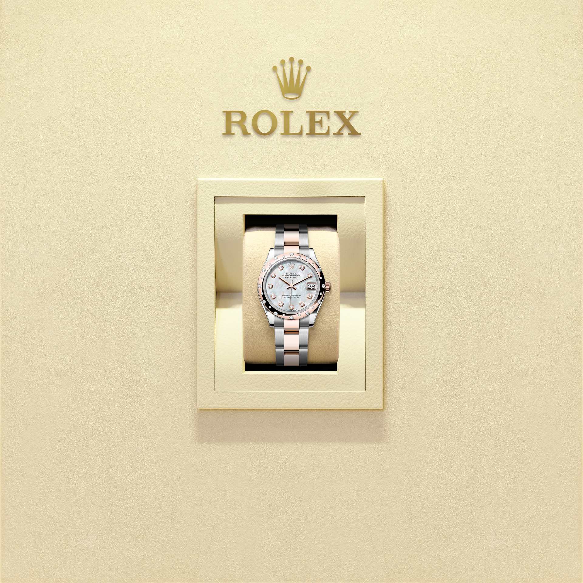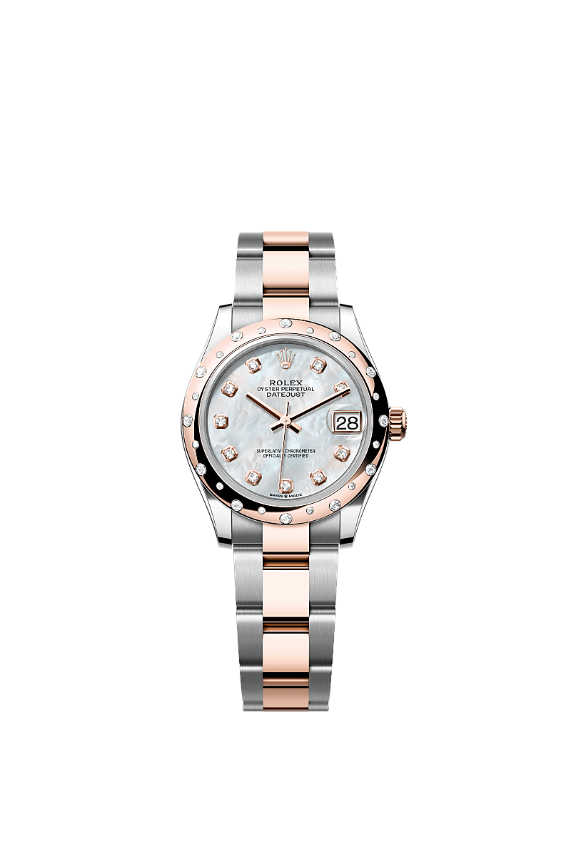 אויסטר פרפטואל דייטג'אסט 31 זה מפלדת אויסטר וזהב אוורוז מצויד בלוח מחוגים עם אם הפנינה לבנה בשיבוץ יהלומים וצמיד אויסטר.