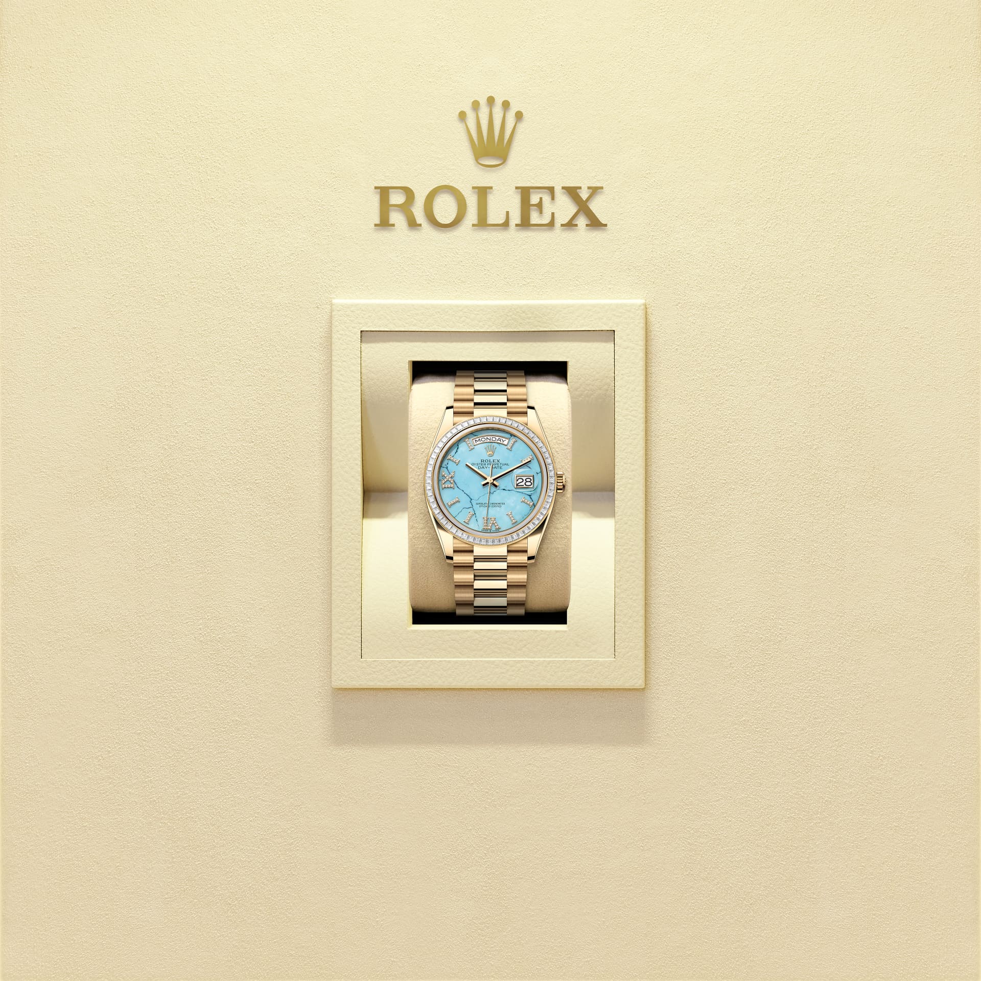 האויסטר פרפטואל דיי-דייט 36 מזהב צהוב 18 קראט עם לוח מחוגים טורקיז, משובץ יהלומים, מסגרת בשיבוץ יהלומים וצמיד President.