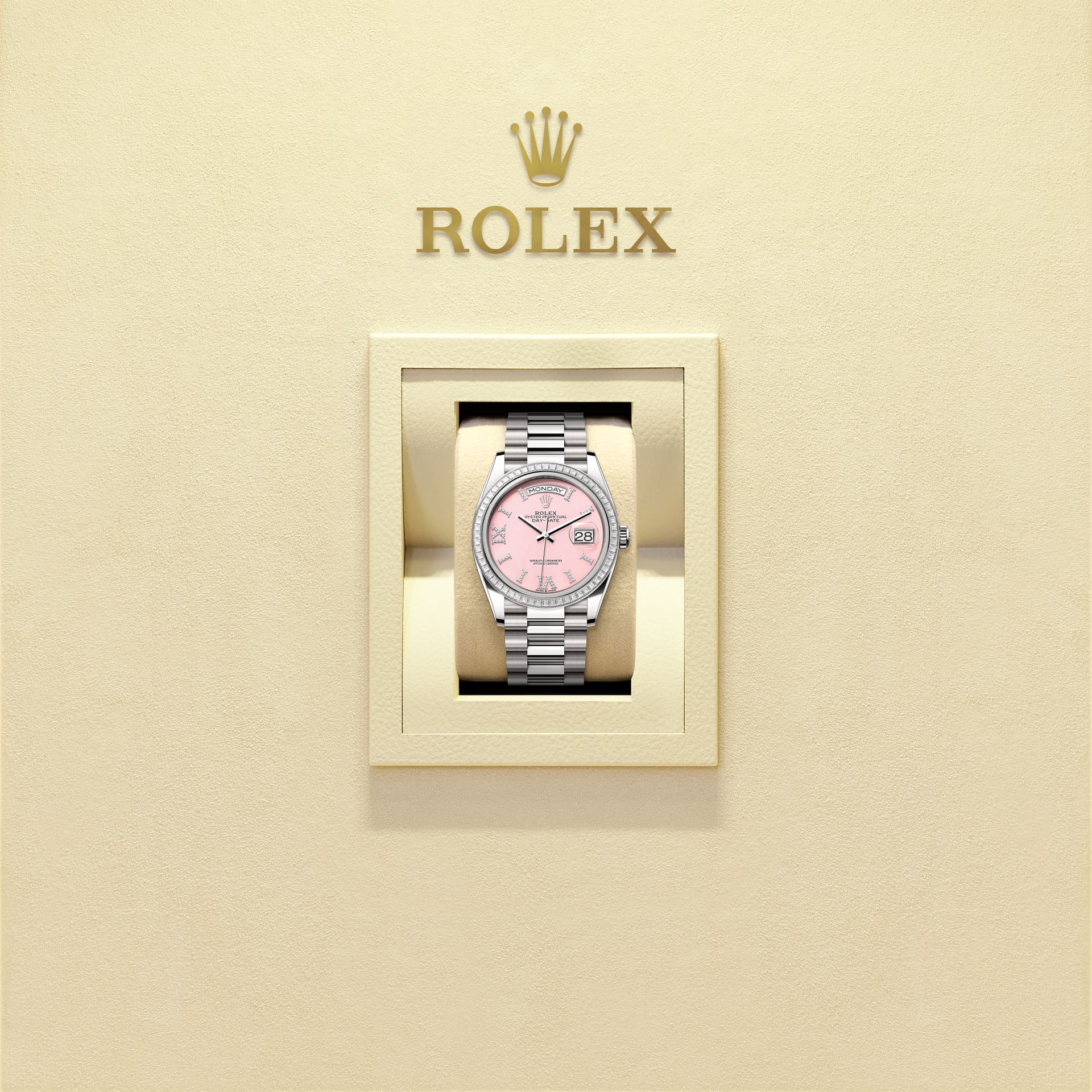 האויסטר פרפטואל דיי-דייט 36 מזהב לבן 18 קראט עם לוח מחוגים עם אופאל ורוד, בשיבוץ יהלומים, מסגרת בשיבוץ יהלומים וצמיד President.