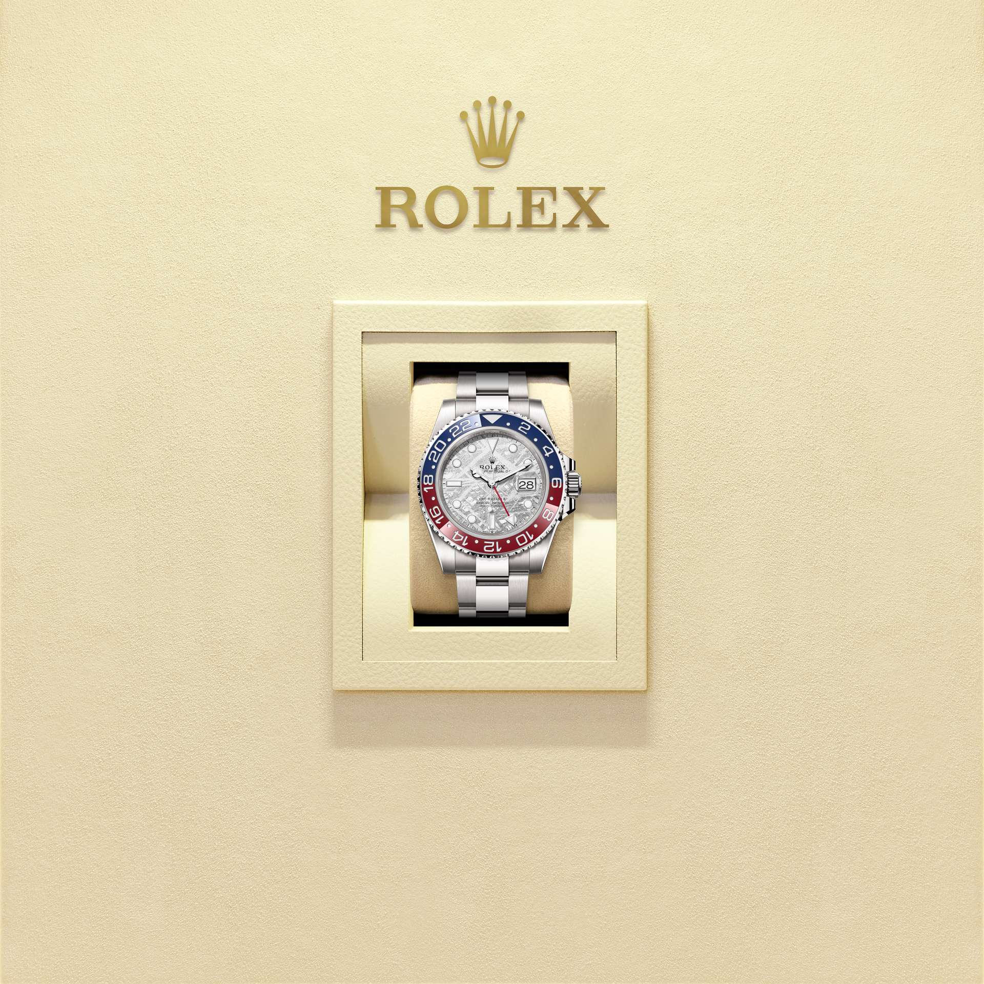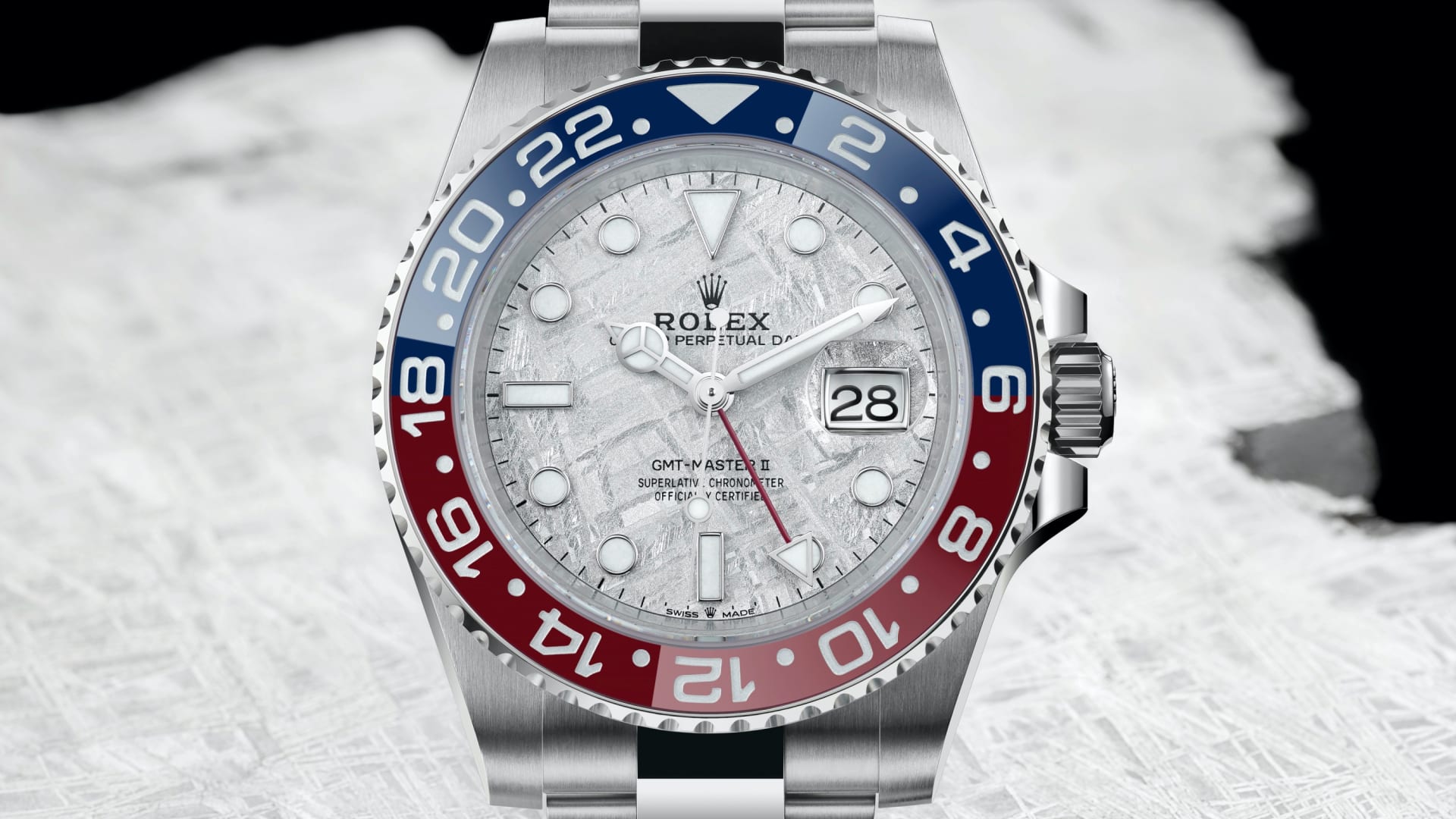 האויסטר פרפטואל GMT-מאסטר II מזהב לבן 18 קראט עם לוח מחוגים מטאוריט, וצמיד אויסטר.
