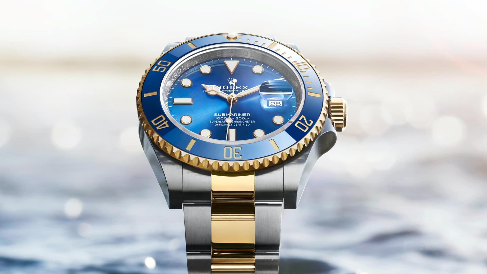 האויסטר פרפטואל סאבמרינר דייט מפלדת אויסטר וזהב צהוב עם שיבוץ פנימי Cerachrom למסגרת מקרמיקה כחולה ולוח מחוגים כחול רויאל עם סימוני שעות רחבים זוהרים.