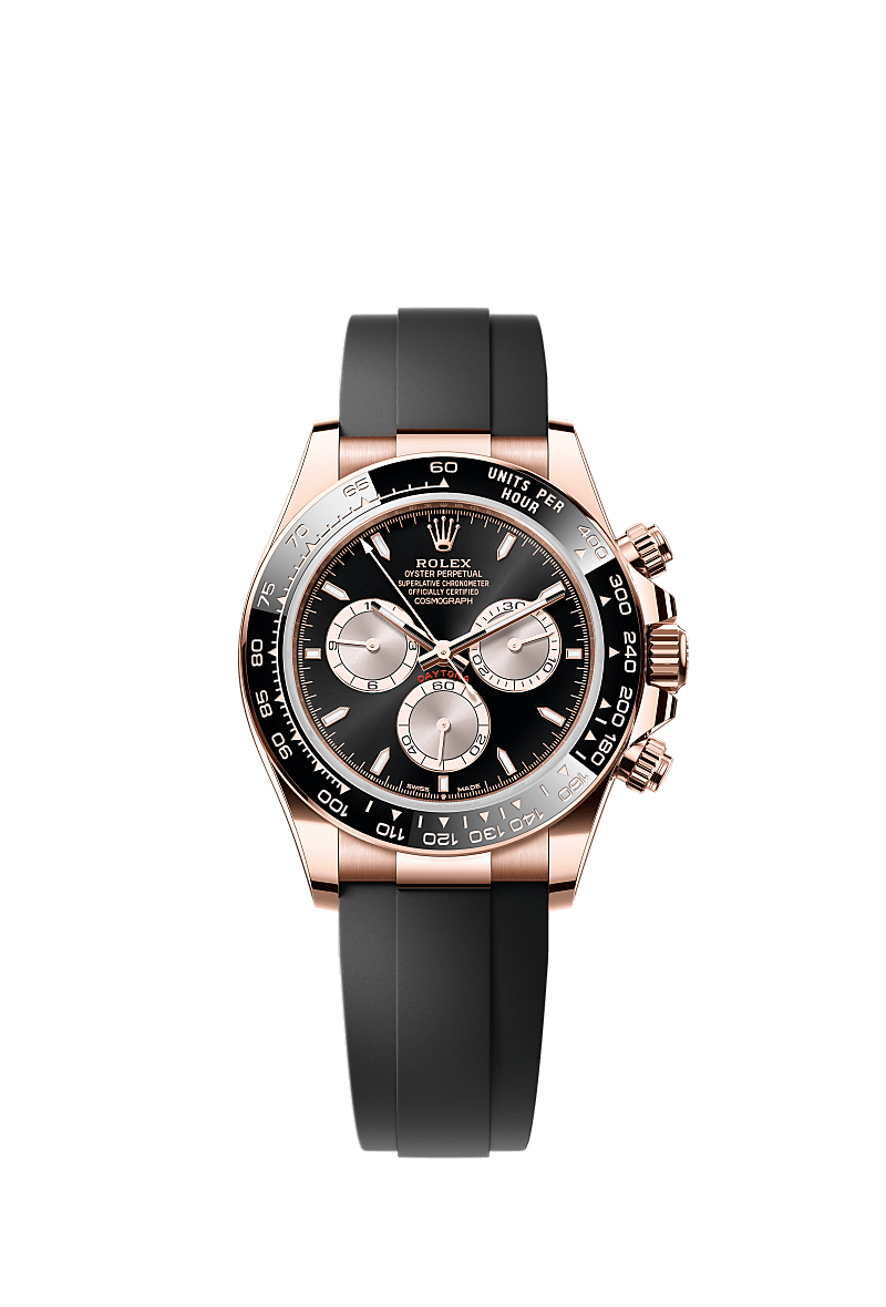 कॉस्मोग्राफ़ डेटोना में ऑयस्टर परपेचुअल 18 कैरेट एवरोज़ सोना, के साथ चमकदार काला और सनडस्ट डायल और ऑयस्टरफ़्लेक्स ब्रेस्लेट, ब्लैक सेराक्रोम की विशेषता एक टेकिमेट्रिक स्केल के साथ बेज़ेल है।