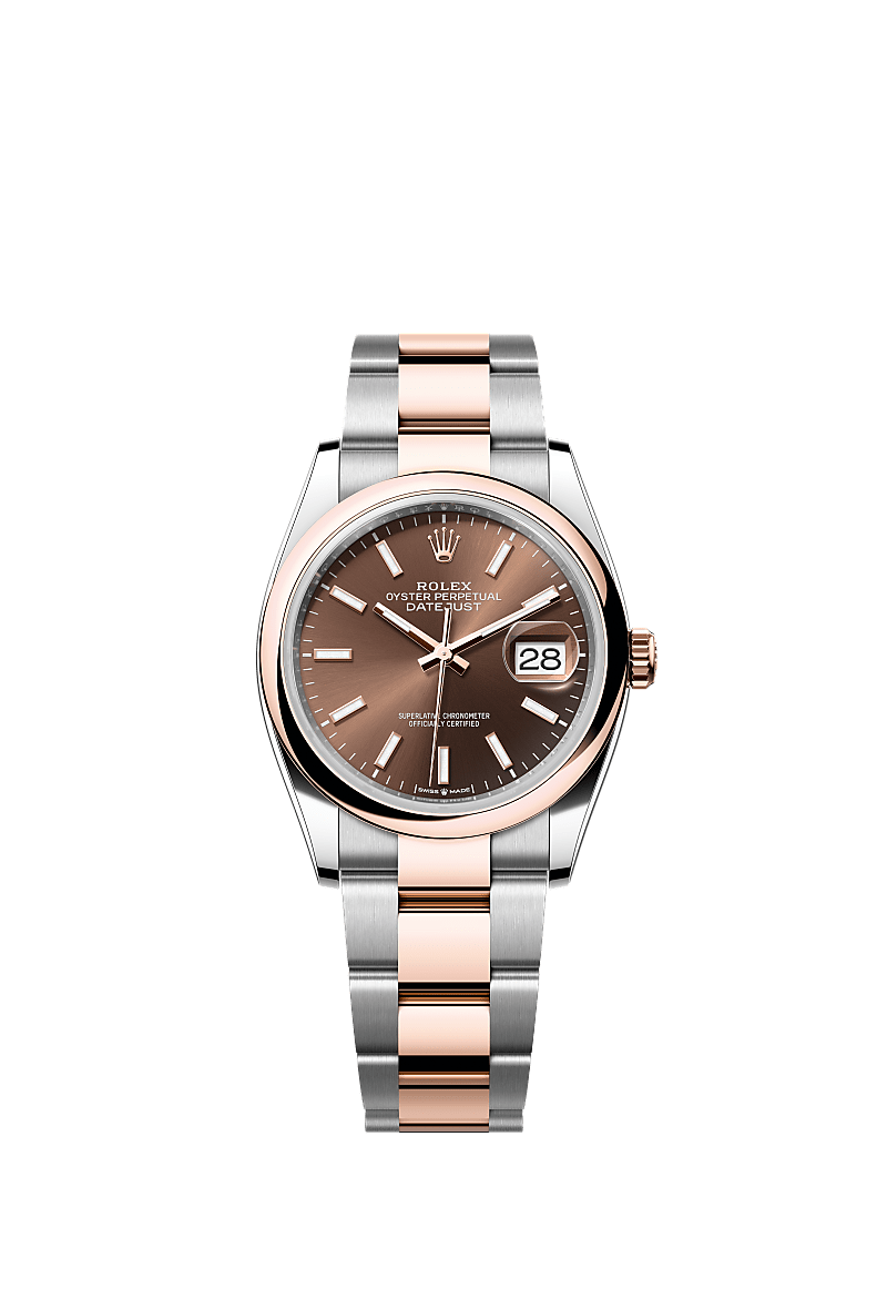 डेटजस्ट 36 में ऑइस्टर पर्पेचुअल ऑयस्टरस्टील और एवरोज़ गोल्ड की विशेषता एक एक चॉकलेट डायल और एक ऑयस्टर ब्रेसलेट।