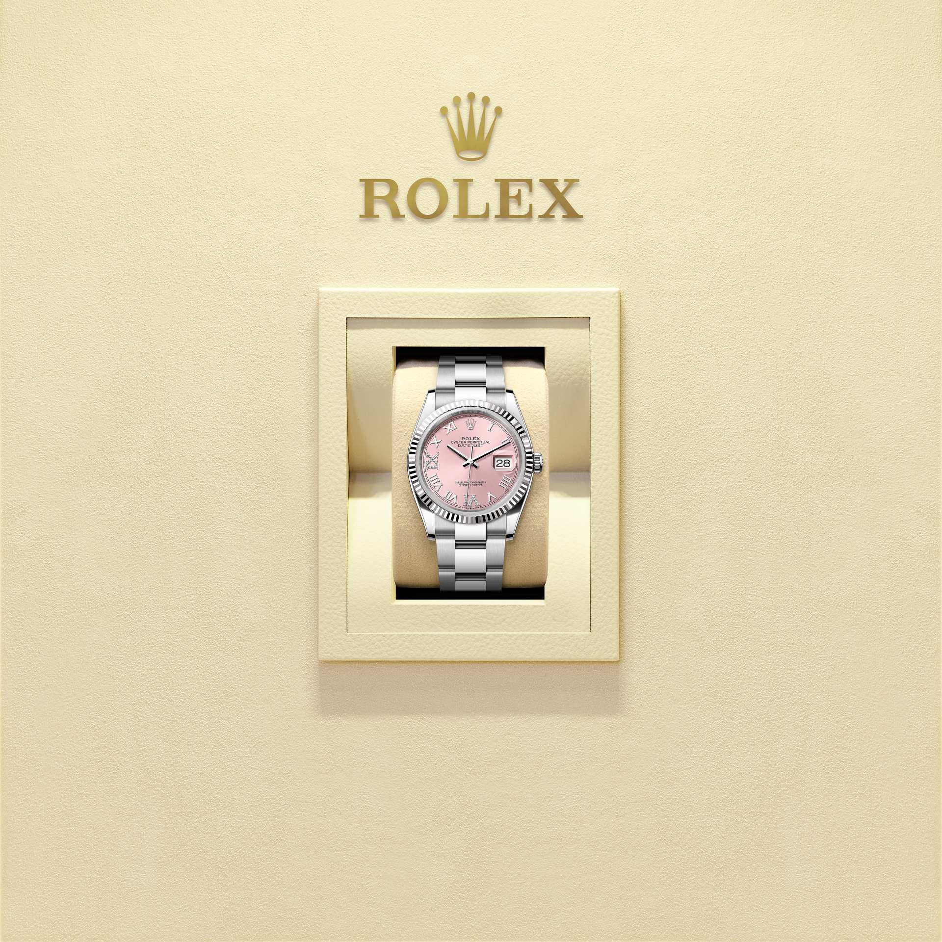 डेटजस्ट 36 में ऑइस्टर पर्पेचुअल ऑयस्टरस्टील और व्हाइट गोल्ड की विशेषता एक गुलाबी, डायमंड-जड़ित डायल और एक ऑयस्टर ब्रेसलेट।