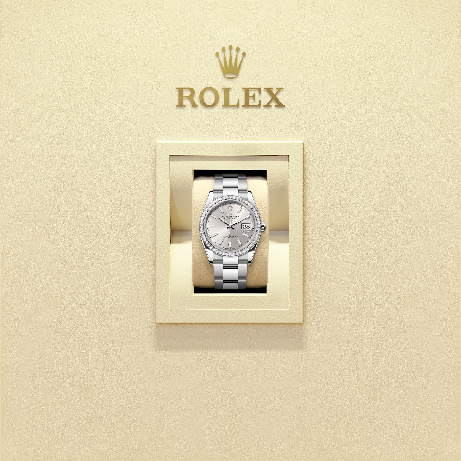 डेटजस्ट 36 में ऑइस्टर पर्पेचुअल ऑयस्टरस्टील और व्हाइट गोल्ड की विशेषता एक सिल्वर डायल और एक ऑयस्टर ब्रेसलेट।