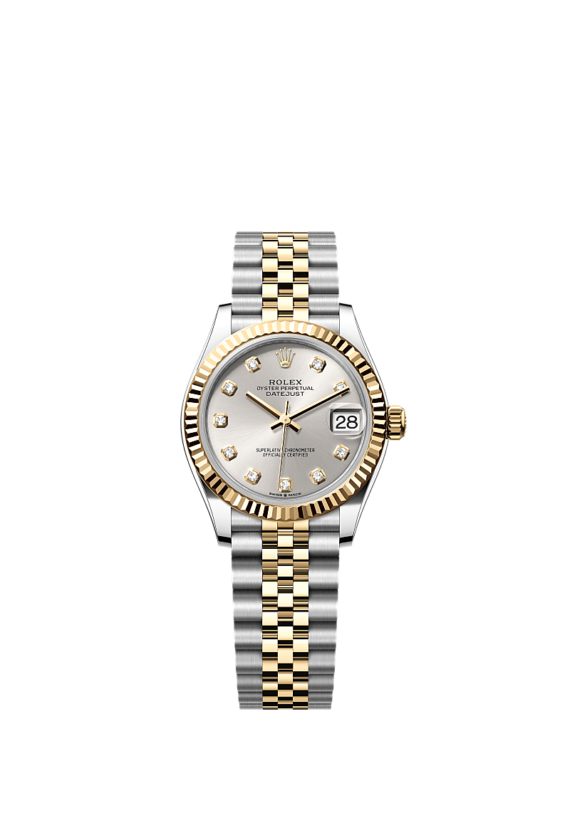 डेटजस्ट 31 में ऑइस्टर पर्पेचुअल ऑयस्टरस्टील और येलो गोल्ड की विशेषता एक सिल्वर, डायमंड-जड़ित डायल और एक जुबिली (Jubilee) ब्रेसलेट।