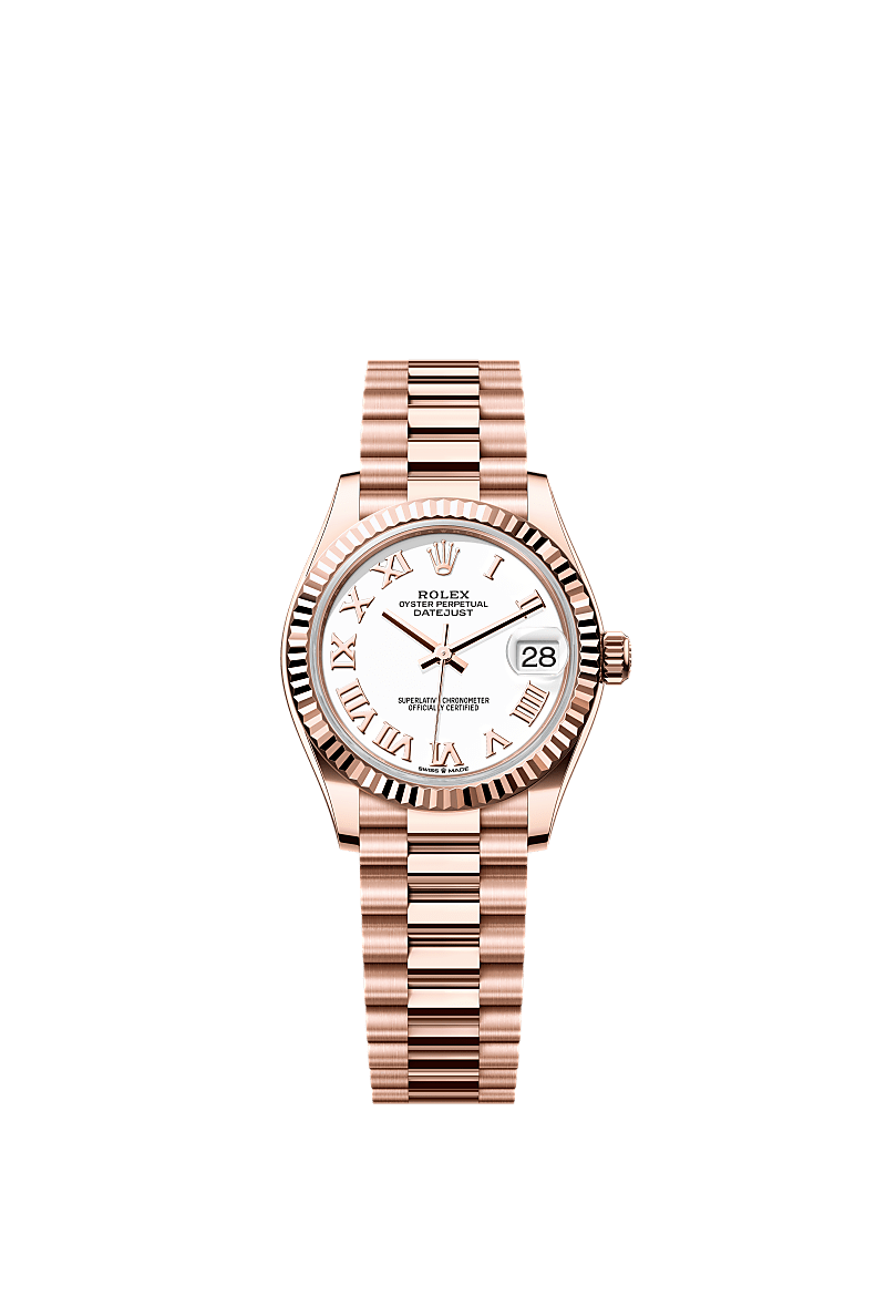 डेटजस्ट 31 में ऑइस्टर पर्पेचुअल 18 कैरेट एवरोज़ सोना की विशेषता एक व्हाइट डायल और एक प्रेसिडेंट (President) ब्रेसलेट।