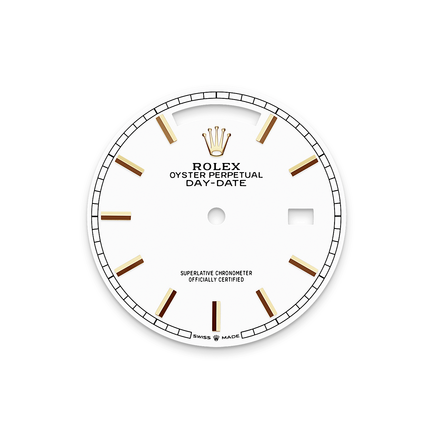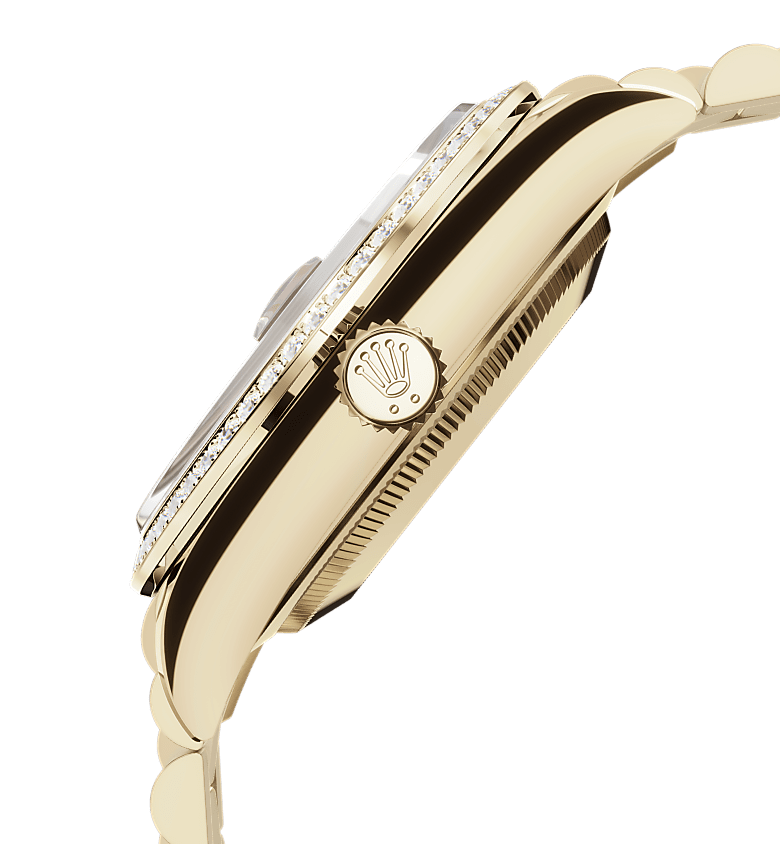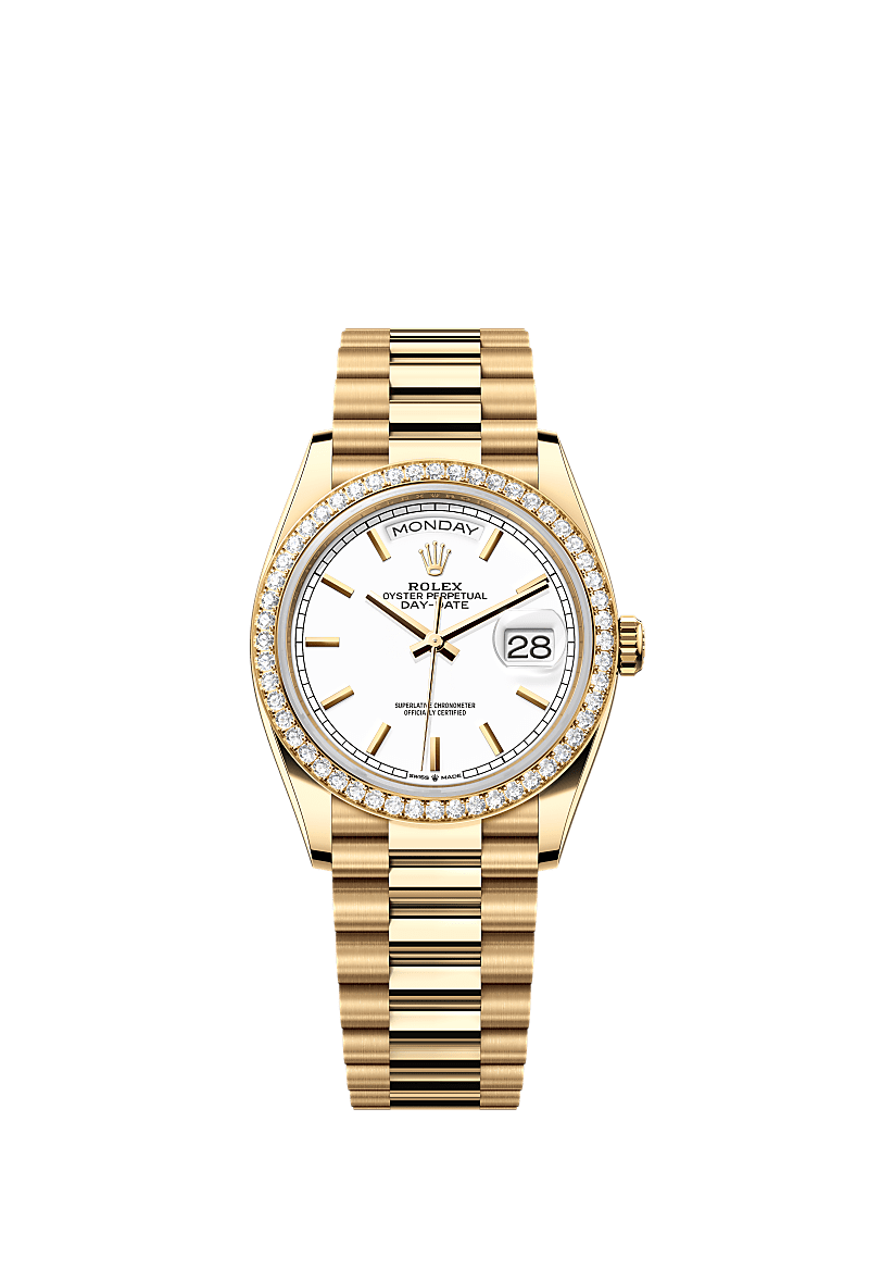 ऑयस्टर परपेचुअल डे-डेट 36 में 18 कैरट पीला सोना के साथ व्हाइट डायल, हीरा जड़ित बेज़ेल और प्रेसिडेंट (President) ब्रेसलेट है।