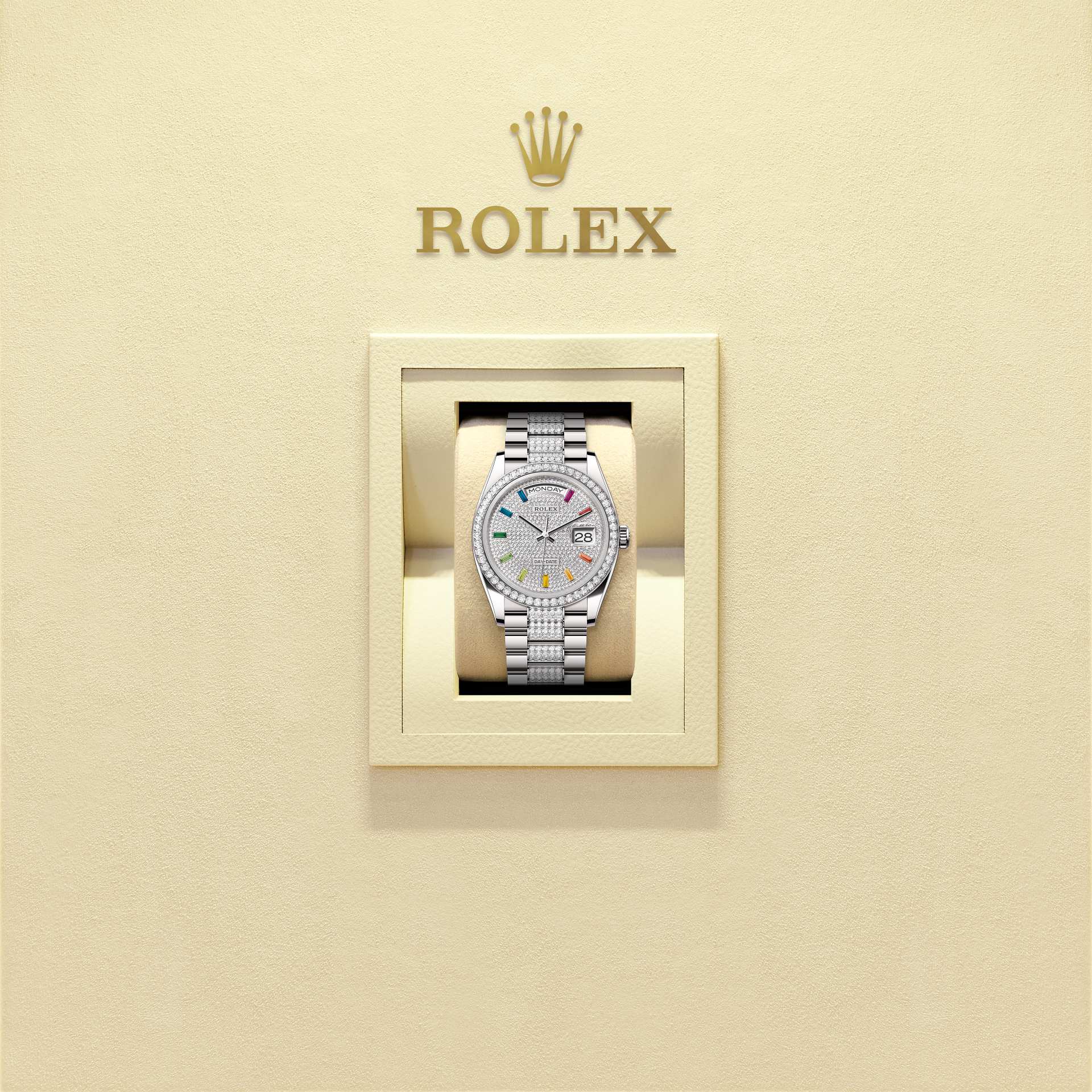 ऑइस्टर पर्पेचुअल डे-डेट 36 में 18 कैरेट सफ़ेद सोना के साथ डायमंड-जटित डायल, डायमंड-सेट बेज़ेल और डायमंड-सेट प्रेसिडेंट (President) ब्रेसलेट है।