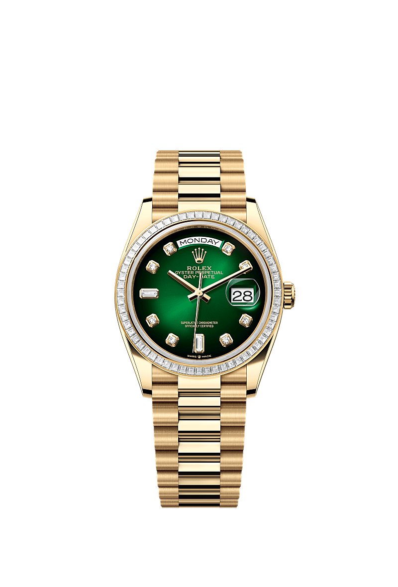 ऑइस्टर पर्पेचुअल डे-डेट 36 में 18 कैरट पीला सोना के साथ एक ग्रीन ऑम्ब्रे, डायमंड-जड़ित डायल, डायमंड-सेट बेज़ेल और प्रेसिडेंट (President) ब्रेसलेट है।