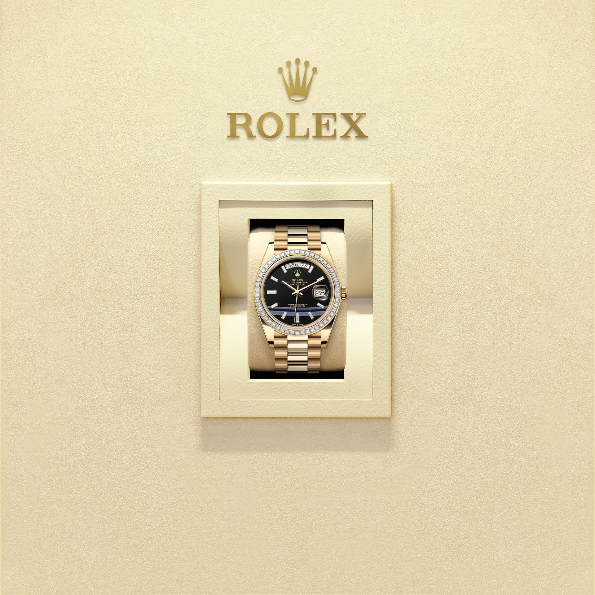 ऑइस्टर पर्पेचुअल डे-डेट 40 में 18 कैरट पीला सोना के साथ डायमंड जड़ित ओनिक्स डायल, डायमंड-सेट बेज़ेल और प्रेसिडेंट (President) ब्रेसलेट है।