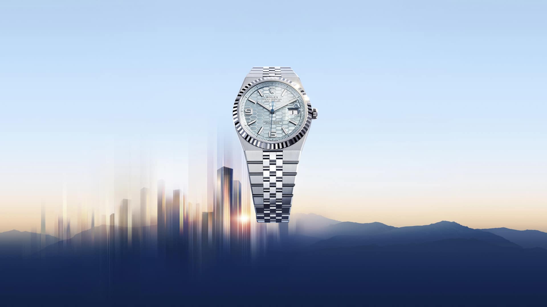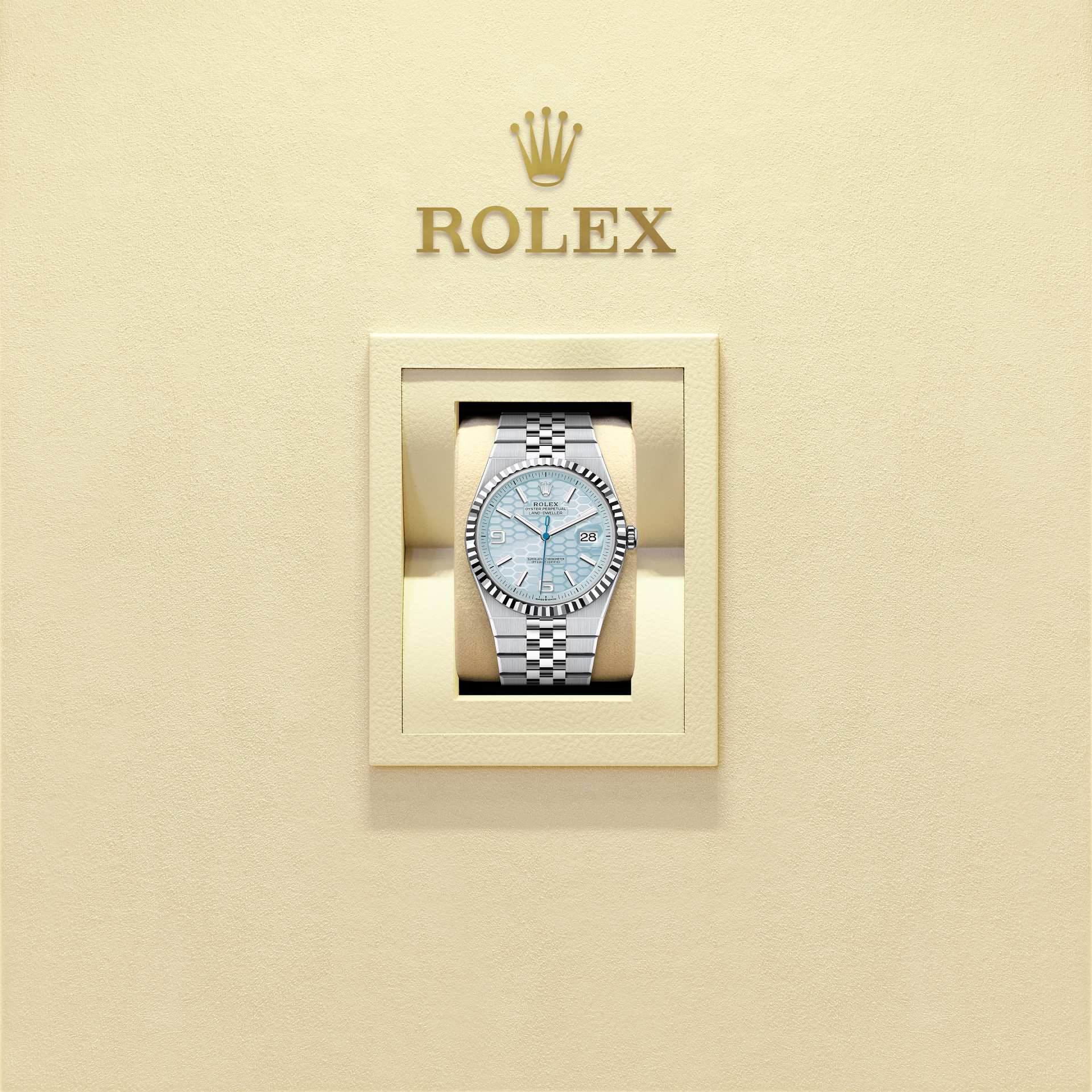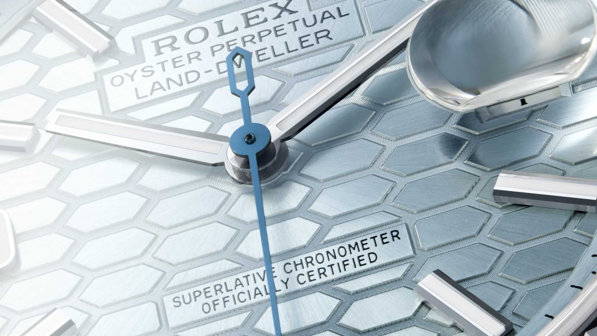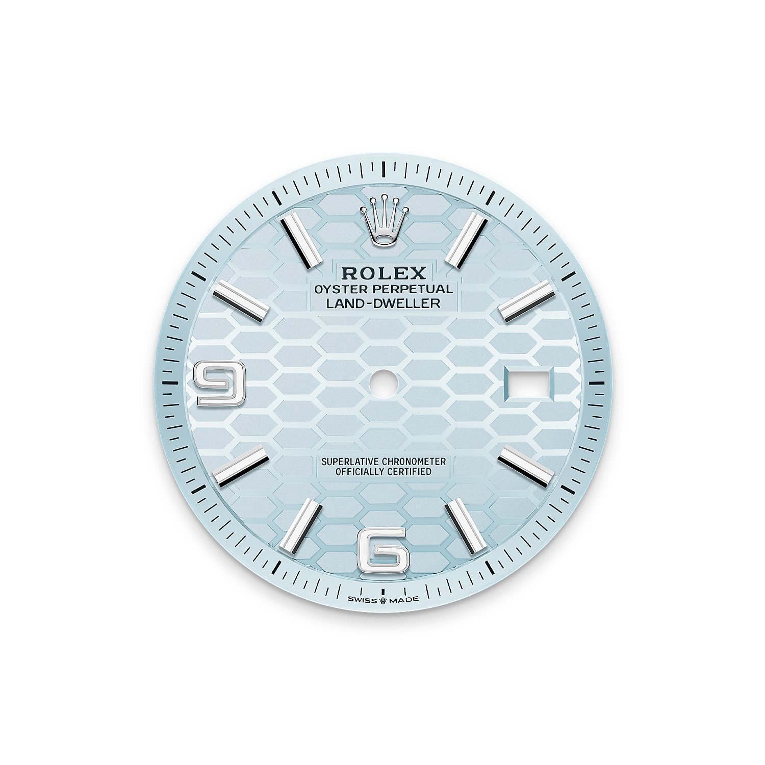 लैंड-ड्वेलर 40 प्लैटिनम में आइस नीला, हनीकॉम्ब (मधुकोश) मोटिफ़ डायल और सपाट जुबिली ब्रेसलेट के साथ।