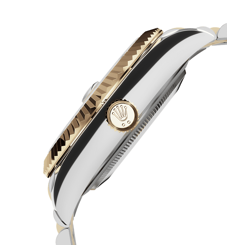 ऑइस्टर पर्पेचुअल स्काई-ड्वेलर में ऑयस्टरस्टील और येलो गोल्ड के साथ चमकदार ब्लैक डायल और जुबिली (Jubilee) ब्रेसलेट है।