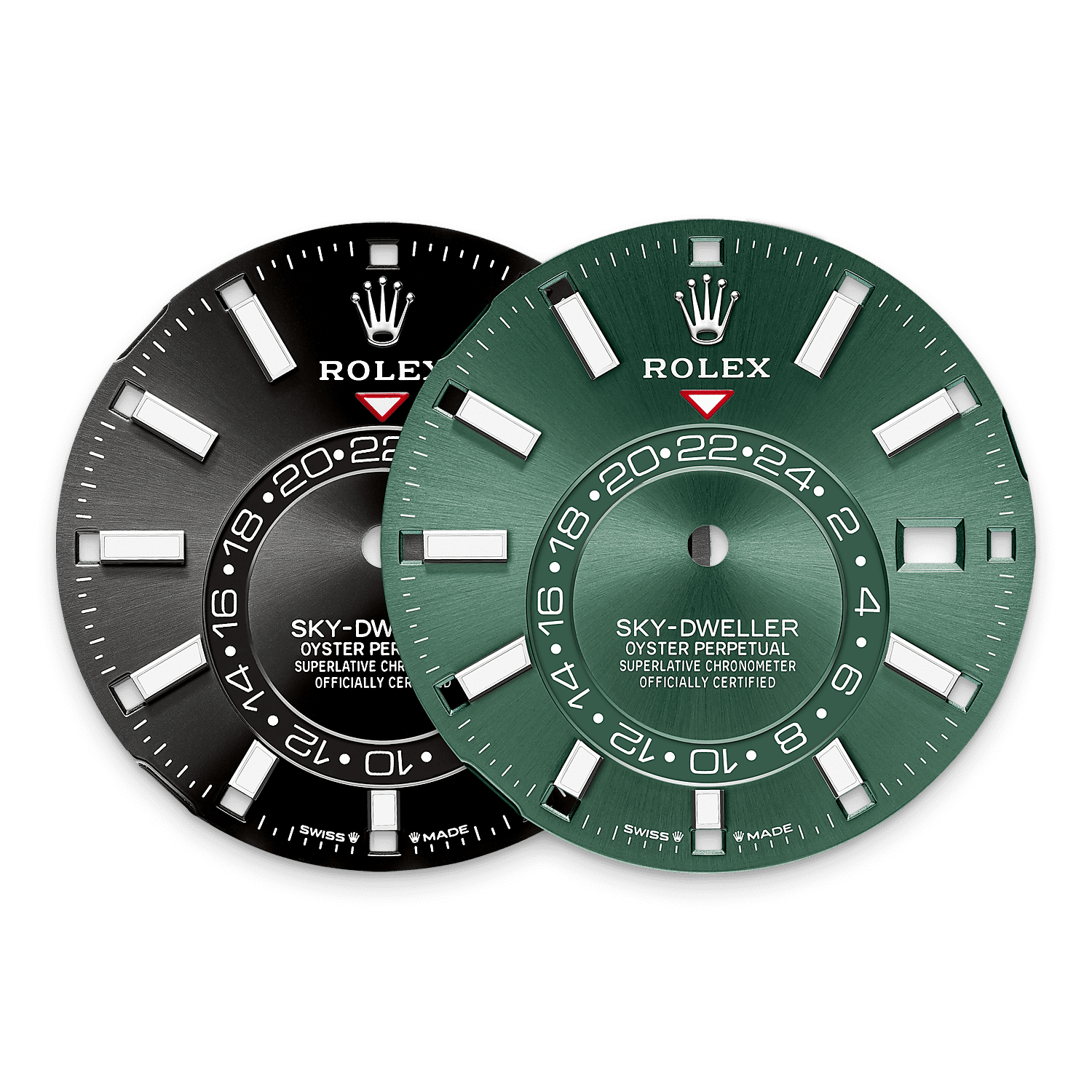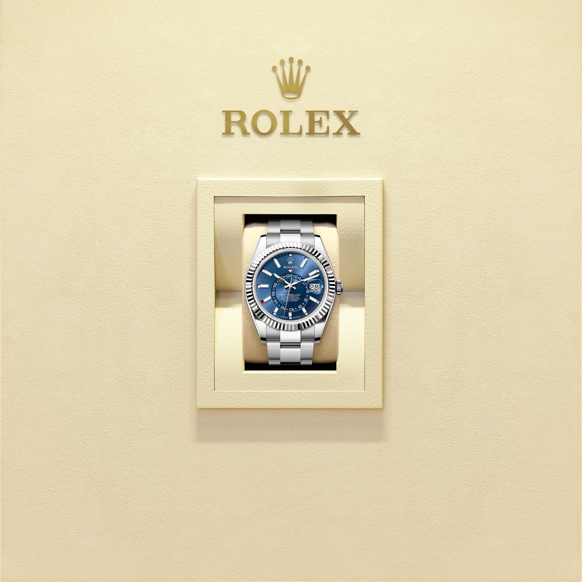 स्काई-ड्वेलर, सफ़ेद रोलेसॉर संस्करण में ऑयस्टरस्टील से बने मज़बूत-लिंक ऑयस्टर ब्रेसलेट पर फ़िट की हुई है, या, पीला रोलेसॉर संस्करण में, ऑयस्टरस्टील तथा पीले सोने का संयोजन करने वाले ऑयस्टर ब्रेसलेट पर फ़िट है।