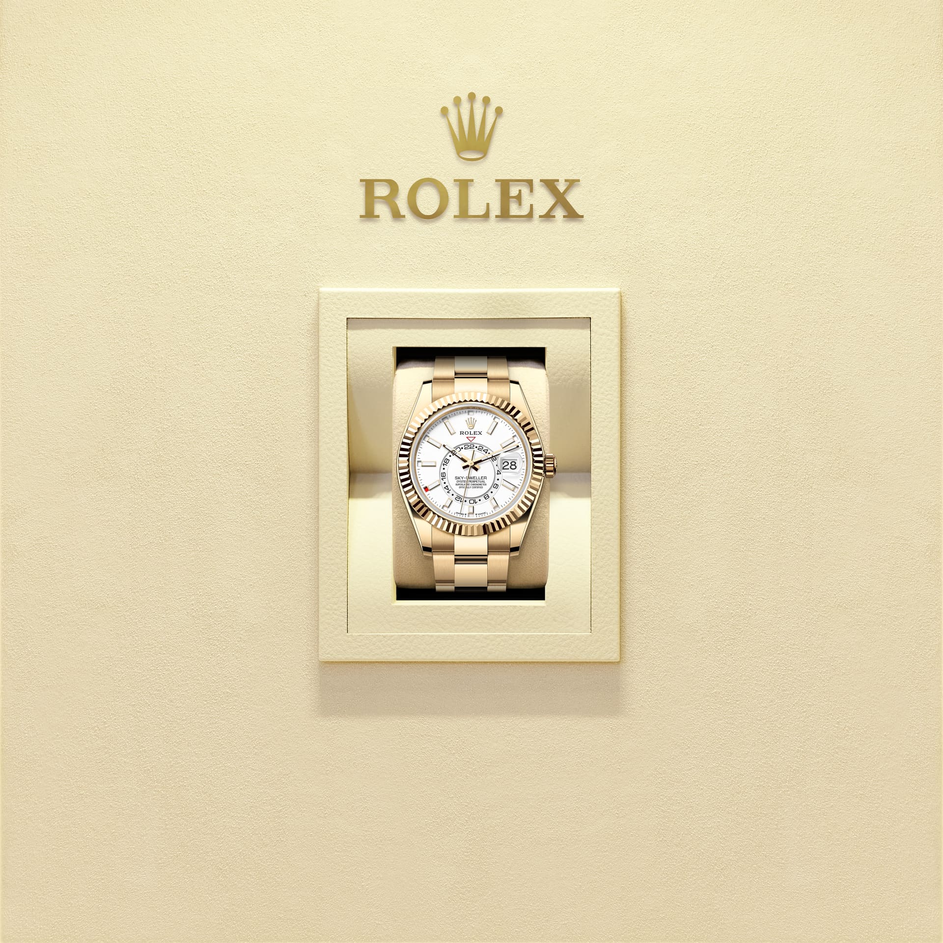 स्काई-ड्वेलर, सफ़ेद रोलेसॉर संस्करण में ऑयस्टरस्टील से बने मज़बूत-लिंक ऑयस्टर ब्रेसलेट पर फ़िट की हुई है, या, पीला रोलेसॉर संस्करण में, ऑयस्टरस्टील तथा पीले सोने का संयोजन करने वाले ऑयस्टर ब्रेसलेट पर फ़िट है।