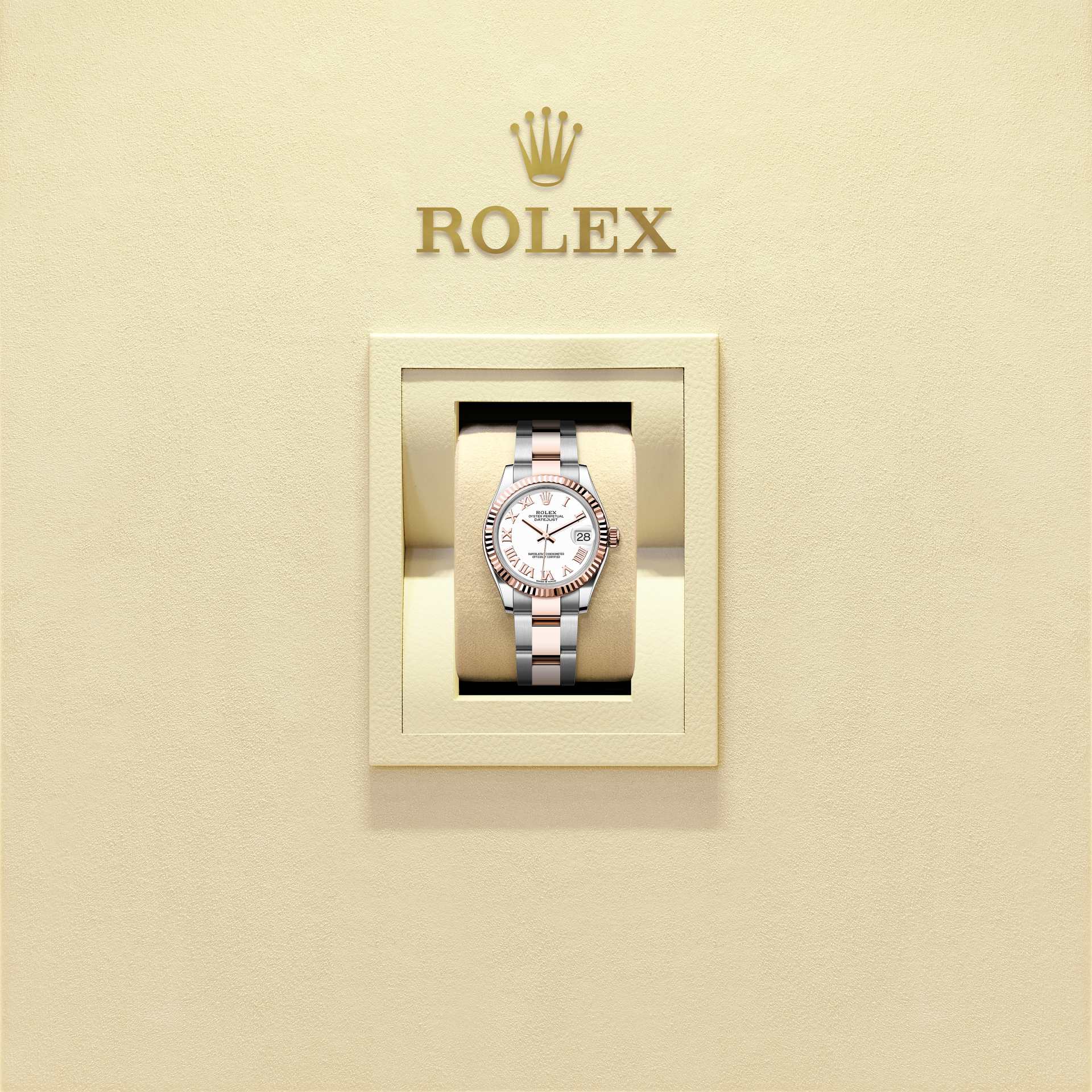 Oyster Perpetual Datejust 31 ini dalam Oystersteel dan emas Everose menampilkan dial jam putih dan rantai jam Oyster.