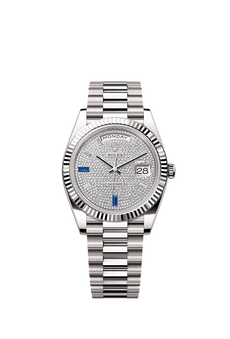 Oyster Perpetual Day-Date 40 dalam emas putih 18 karat dengan dial jam dihiasi berlian, bezel beralur dan rantai jam President.