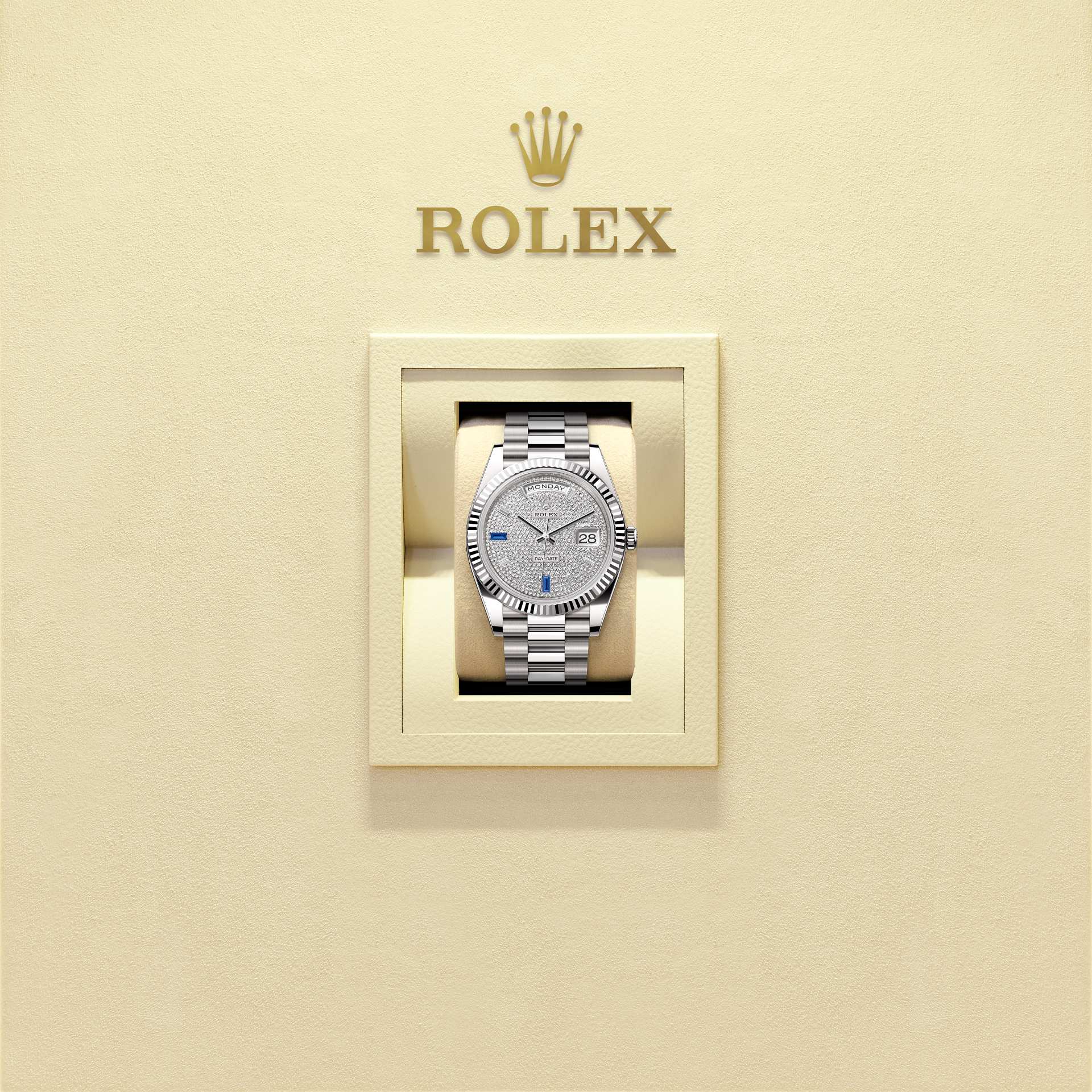 Dial jamnya menampilkan pelat bertabur berlian dengan 8 berlian potongan baguette dan 2 safir potongan baguette di posisi pukul 6 dan 9 tepat. Berlian, safir, rubi, zamrud – batu paling mulia dan paling berharga dipilih untuk menghiasi jam tangan Rolex. Rolex memiliki keahlian dan peralatan internal yang memungkinkannya menghiasi model apa pun dalam katalognya.