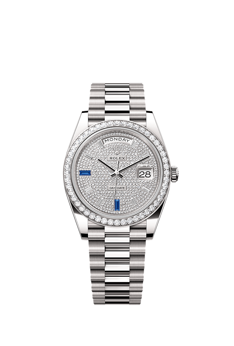 Oyster Perpetual Day-Date 40 dalam emas putih 18 karat, dengan dial jam dihiasi berlian, bezel tampilan dengan berlian dan rantai jam President.