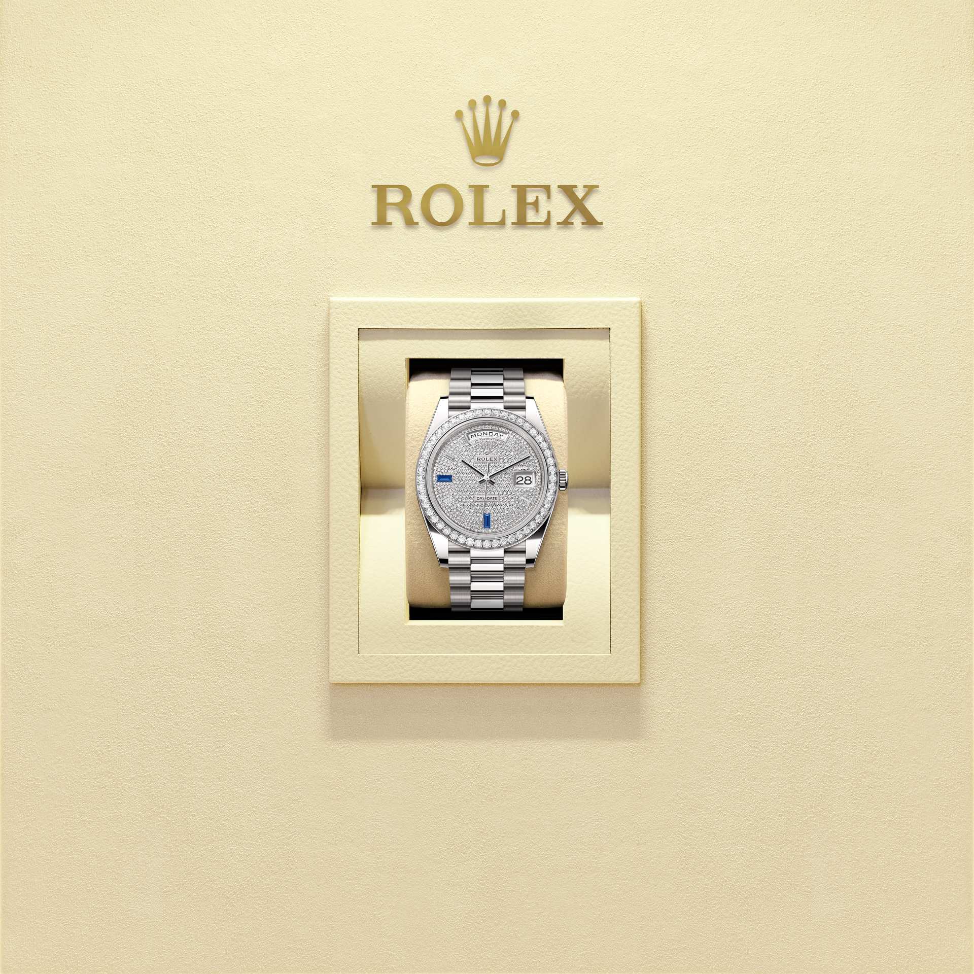 Dial jamnya menampilkan pelat bertabur berlian dengan 8 berlian potongan baguette dan 2 safir potongan baguette di posisi pukul 6 dan 9 tepat. Berlian, safir, rubi, zamrud – batu paling mulia dan paling berharga dipilih untuk menghiasi jam tangan Rolex. Rolex memiliki keahlian dan peralatan internal yang memungkinkannya menghiasi model apa pun dalam katalognya.