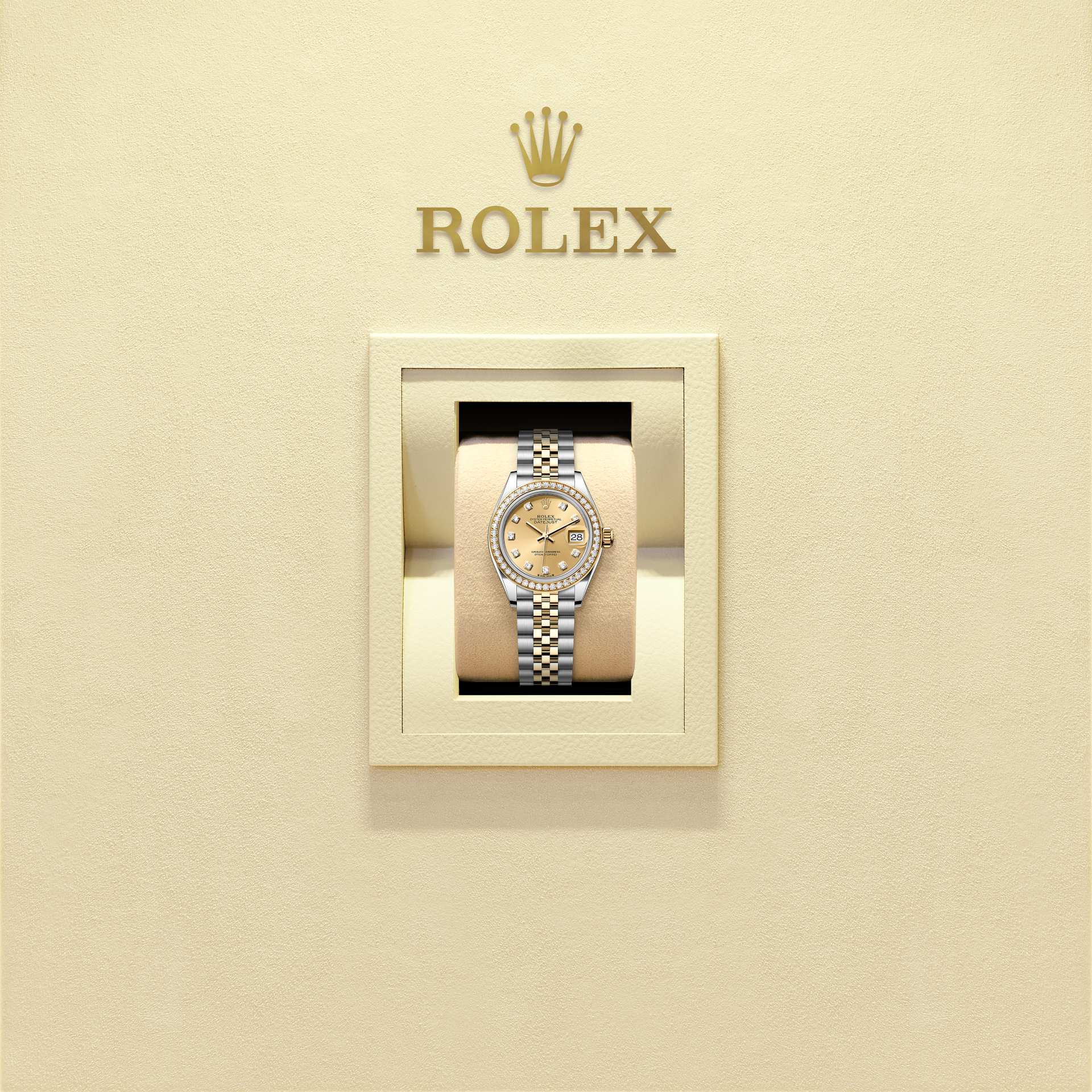 Oyster Perpetual Lady-Datejust ini dalam Oystersteel dan emas kuning menampilkan dial jam berwarna sampanye, tampil dengan berlian dan rantai jam Jubilee.