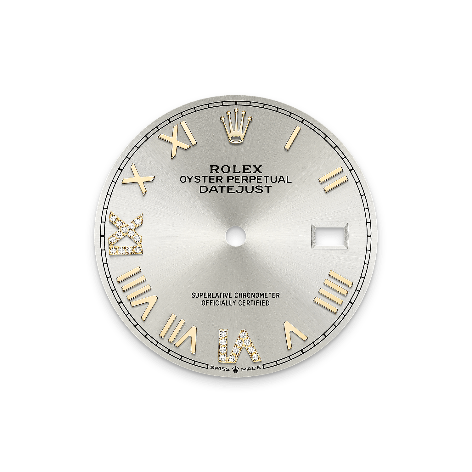 Il quadrante presenta numeri romani VI e IX in oro 18 ct con 24 diamanti. La finitura soleil crea delicati riflessi di luce su molti quadranti della collezione Oyster Perpetual. Per ottenerla, si fa ricorso a sapienti tecniche di spazzolatura che producono lievi scanalature che si diramano dal centro del quadrante verso l’esterno.