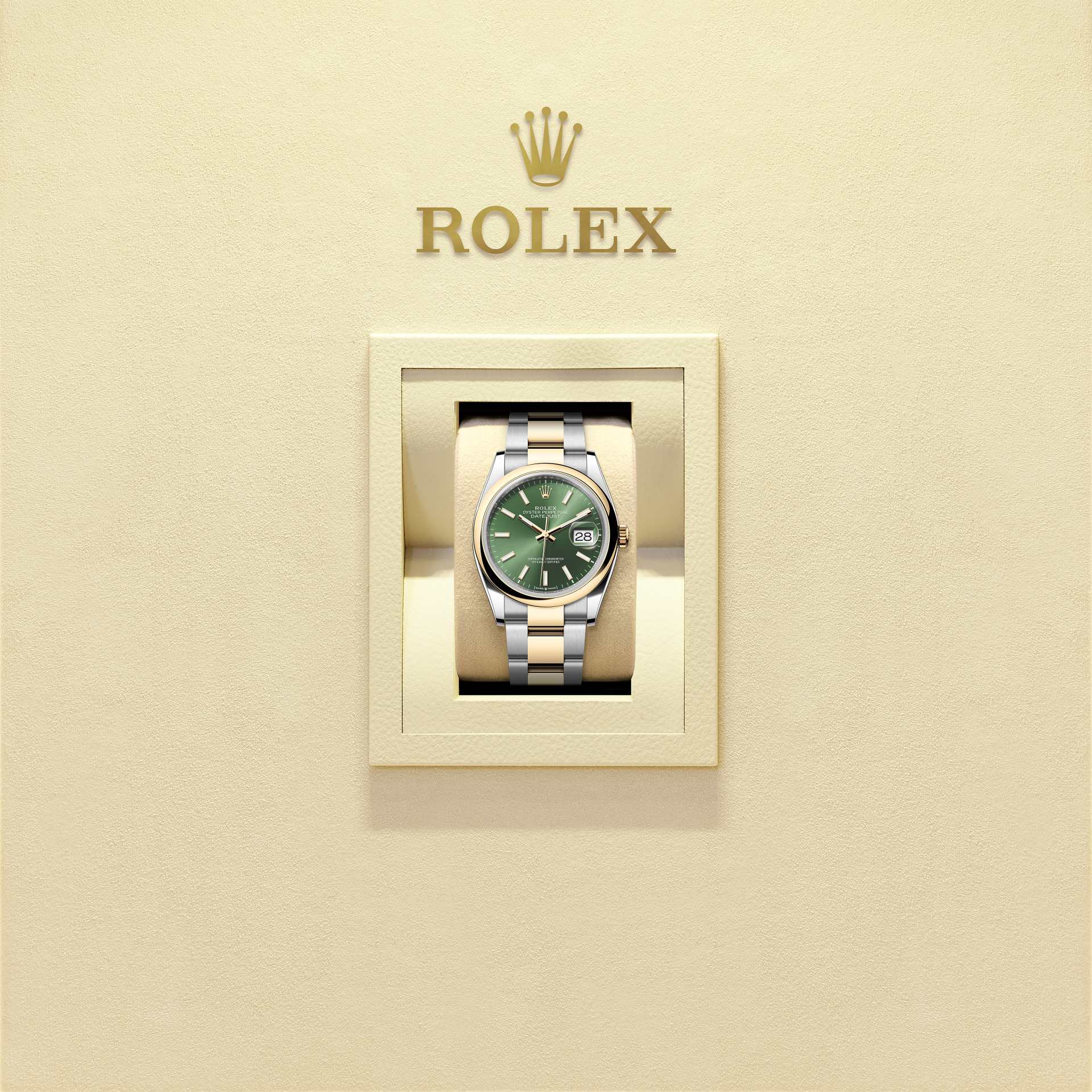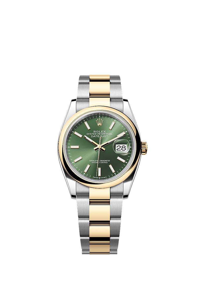 Oyster Perpetual Datejust 36 in acciaio Oystersteel e oro giallo con quadrante verde oliva e bracciale Oyster.