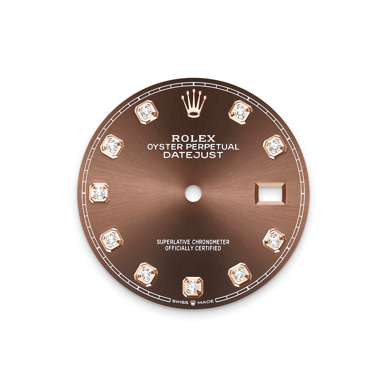 Il quadrante presenta diamanti in castoni d’oro 18 ct. La finitura soleil crea delicati riflessi di luce su molti quadranti della collezione Oyster Perpetual. Per ottenerla, si fa ricorso a sapienti tecniche di spazzolatura che producono lievi scanalature che si diramano dal centro del quadrante verso l’esterno.