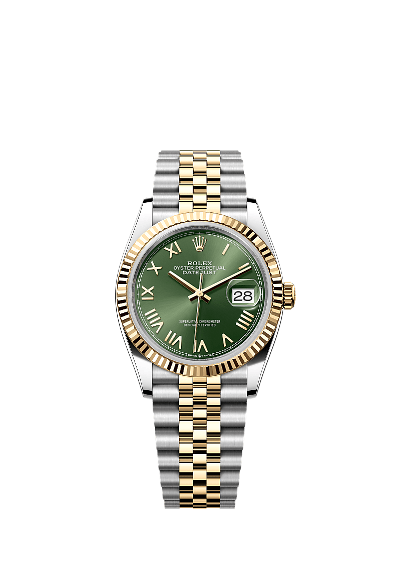 Oyster Perpetual Datejust 36 in acciaio Oystersteel e oro giallo con quadrante verde oliva e bracciale Jubilee.