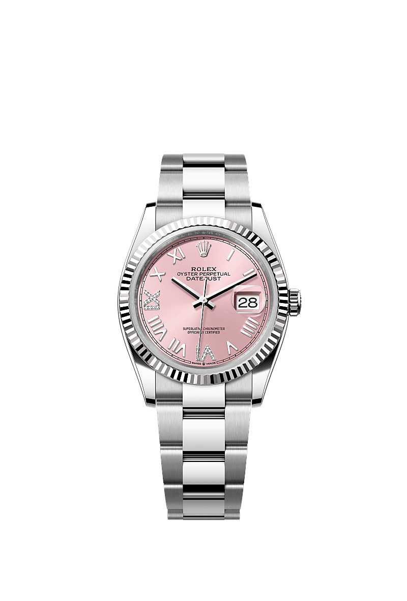 Oyster Perpetual Datejust 36 in acciaio Oystersteel e oro bianco con quadrante rosa con diamanti e bracciale Oyster.