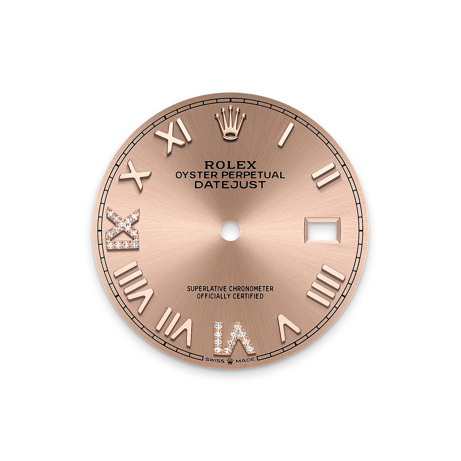 Il quadrante presenta numeri romani VI e IX in oro 18 ct con 24 diamanti. La finitura soleil crea delicati riflessi di luce su molti quadranti della collezione Oyster Perpetual. Per ottenerla, si fa ricorso a sapienti tecniche di spazzolatura che producono lievi scanalature che si diramano dal centro del quadrante verso l’esterno.