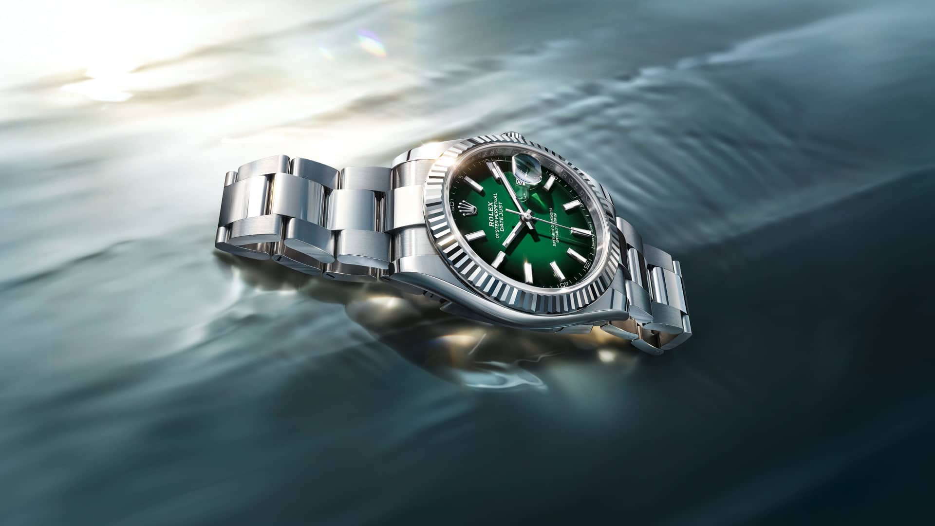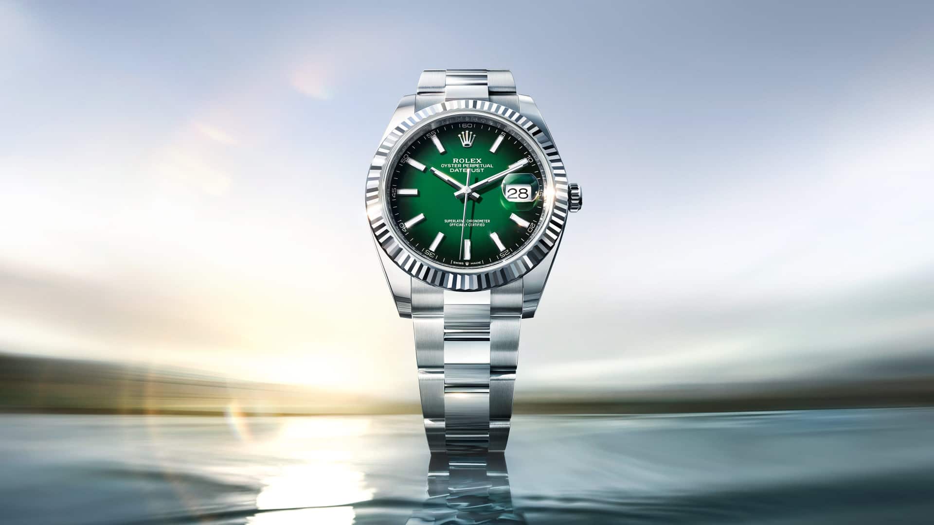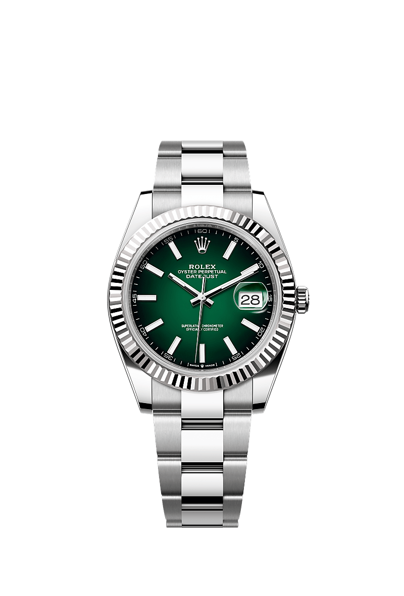 Oyster Perpetual Datejust 41 in acciaio Oystersteel e oro bianco con quadrante verde ombré e bracciale Oyster.