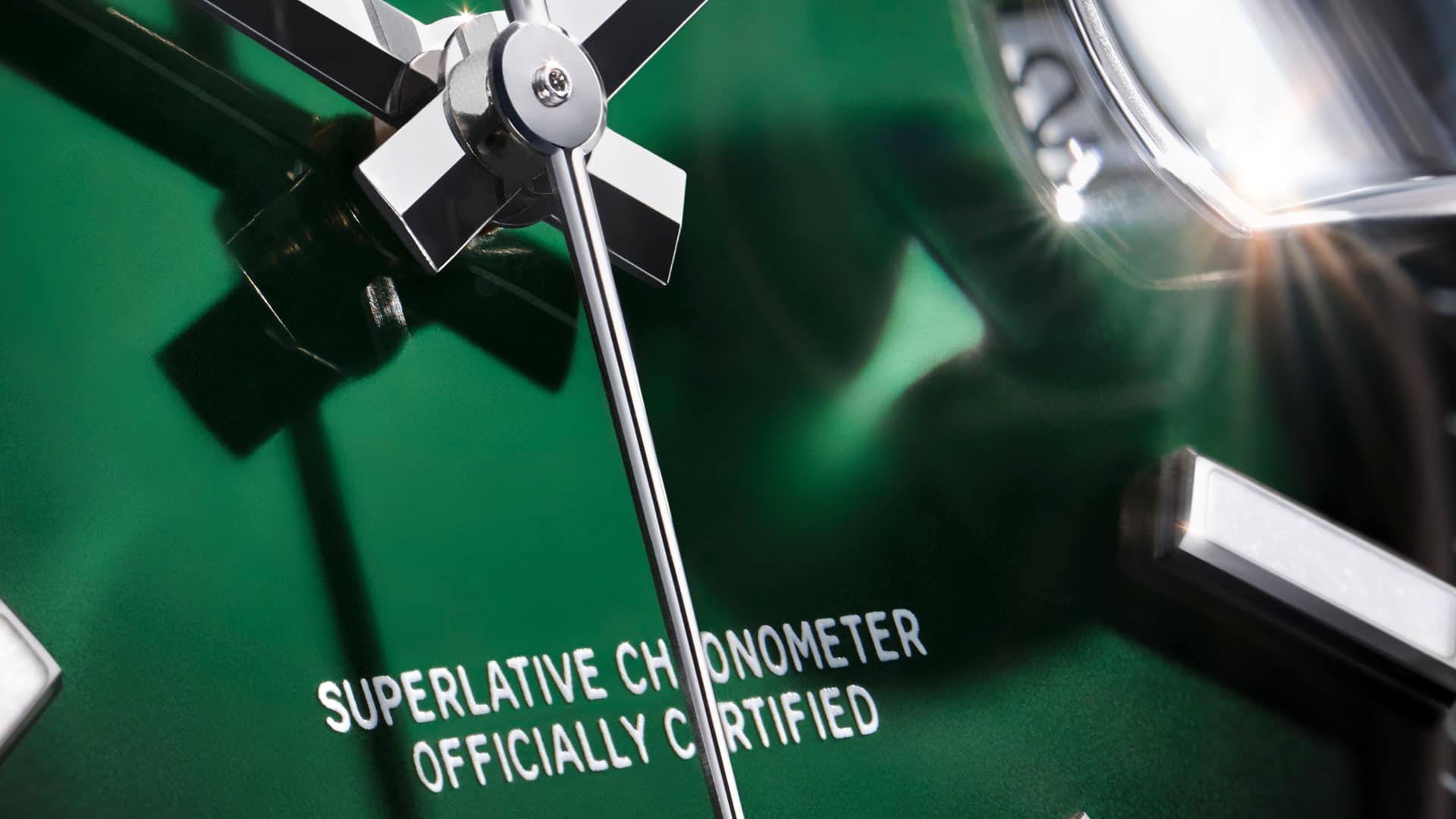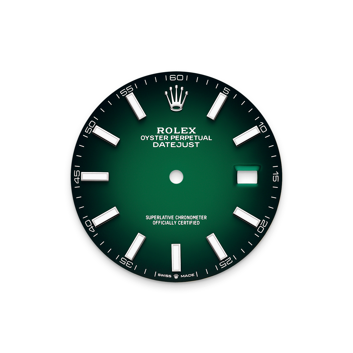 Il fondo di questo quadrante è realizzato prima apponendo la lacca verde, poi, come tutti i quadranti ombré, creando la sfumatura di colore mediante polverizzazione concentrica di lacca nera. Su questo quadrante, che presenta indici Chromalight, le diciture di colore bianco risaltano particolarmente.
