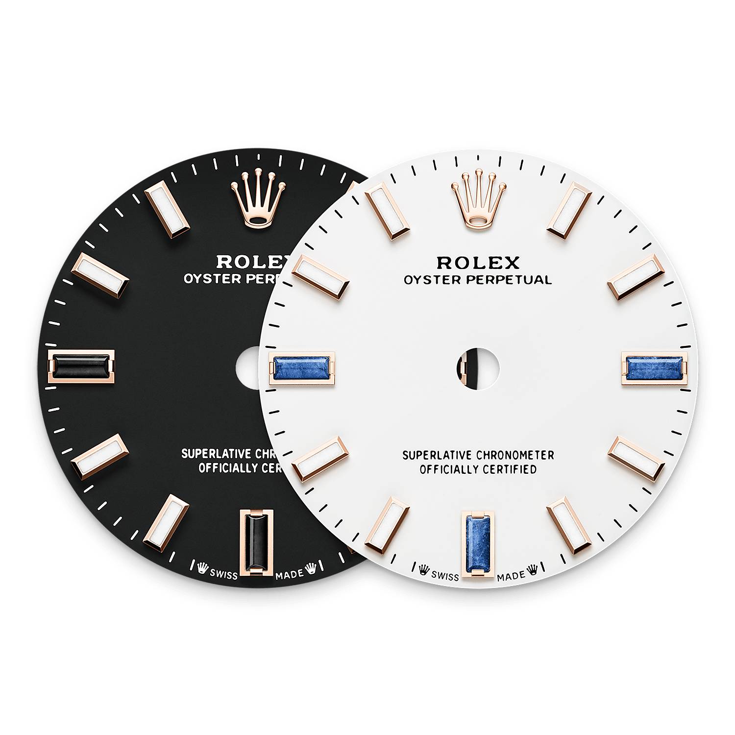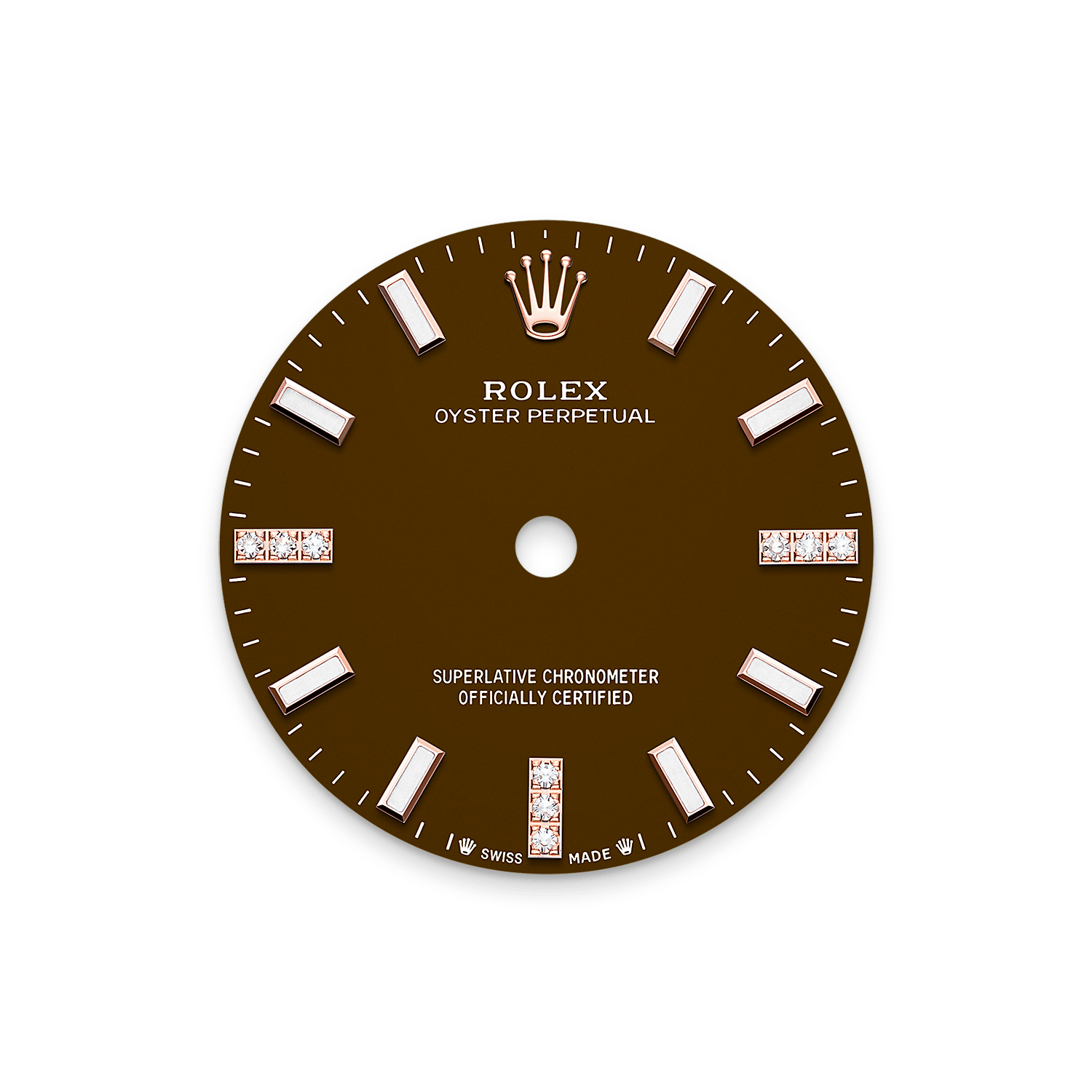 Il quadrante presenta indici in oro 18 ct a ore 3, 6 e 9, con 9 diamanti. I colori creati per la gamma Oyster Perpetual esistono inizialmente sotto forma di lacca, che deve essere applicata con cura e in modo omogeneo per ottenere una superficie uniforme. L’operazione avviene in una camera ad ambiente controllato per evitare che polvere e impurità si depositino sulla superficie.