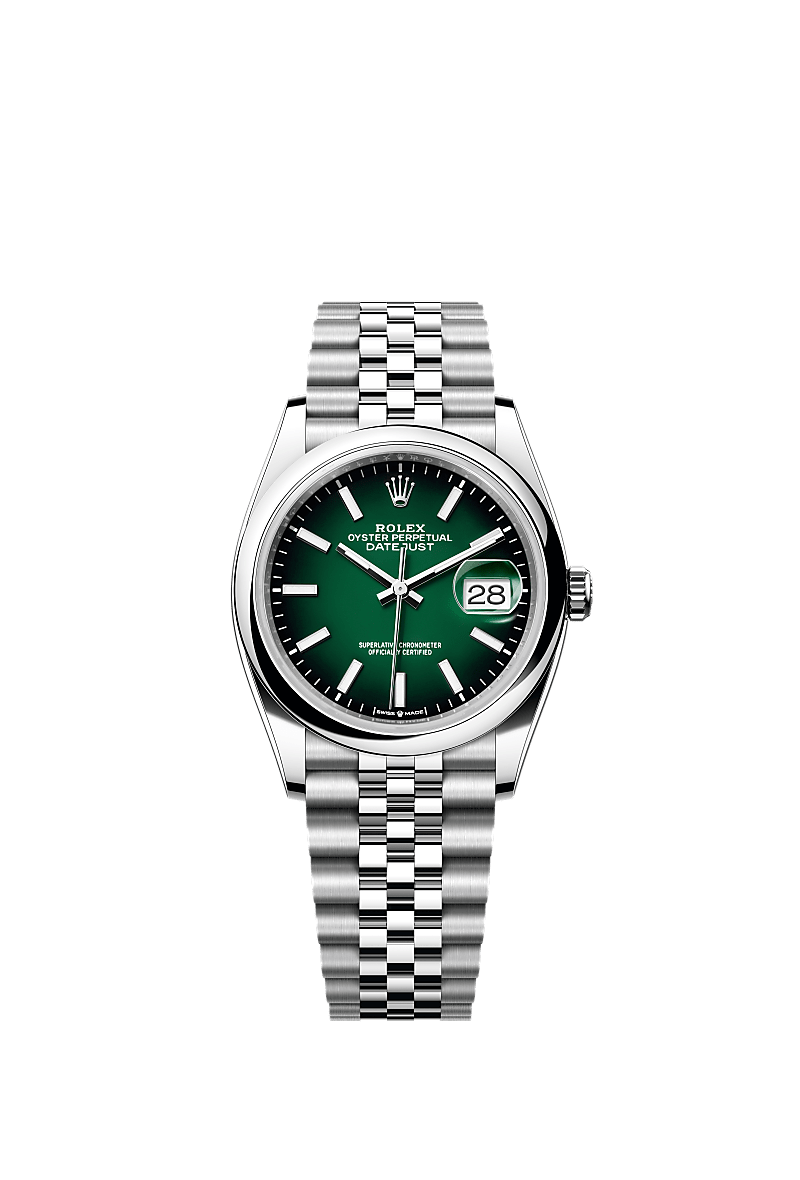 Oyster Perpetual Datejust 36 in acciaio Oystersteel con quadrante verde ombré e bracciale Jubilee.
