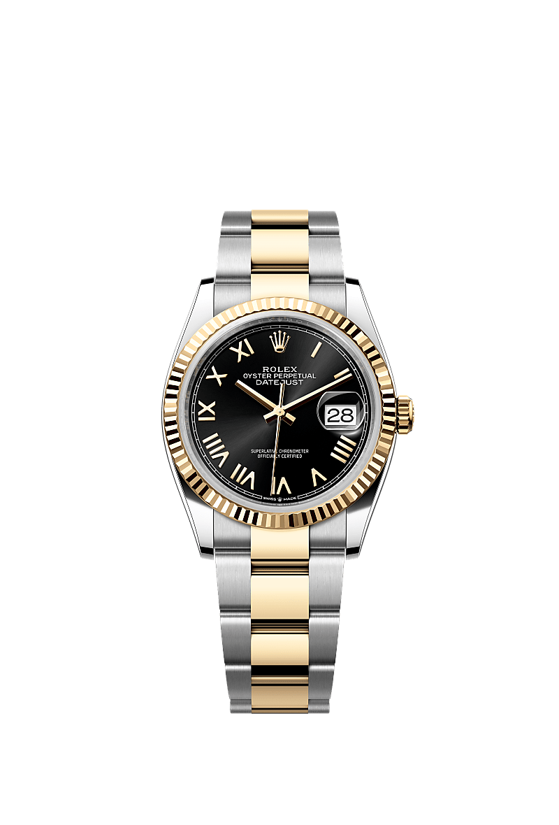 Oyster Perpetual Datejust 36 in acciaio Oystersteel e oro giallo con quadrante nero vivo e bracciale Oyster.