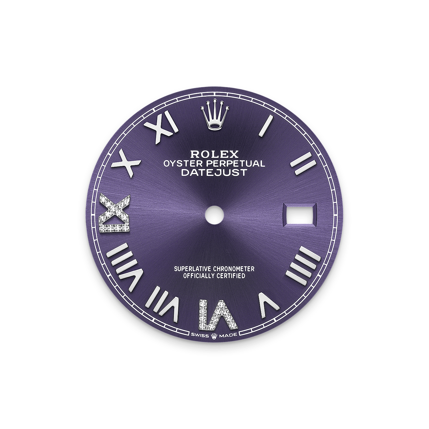 Il quadrante presenta numeri romani VI e IX in oro 18 ct con 24 diamanti. La finitura soleil crea delicati riflessi di luce su molti quadranti della collezione Oyster Perpetual. Per ottenerla, si fa ricorso a sapienti tecniche di spazzolatura che producono lievi scanalature che si diramano dal centro del quadrante verso l’esterno.