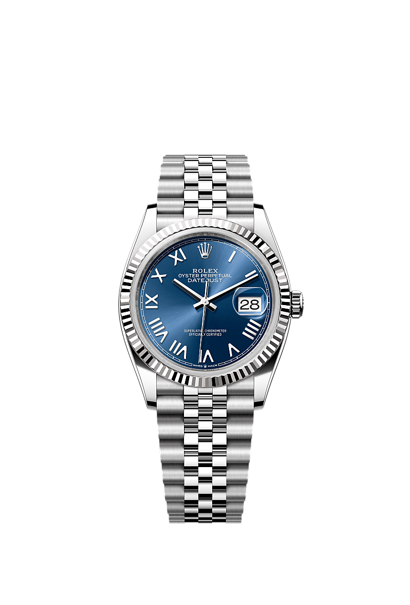 Oyster Perpetual Datejust 36 in acciaio Oystersteel e oro bianco con quadrante blu vivo e bracciale Jubilee.