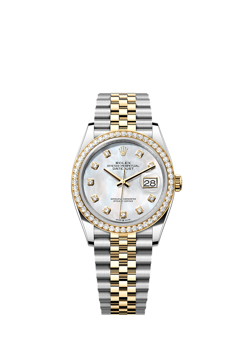 Oyster Perpetual Datejust 36 in acciaio Oystersteel e oro giallo con quadrante in madreperla bianca con diamanti e bracciale Jubilee.