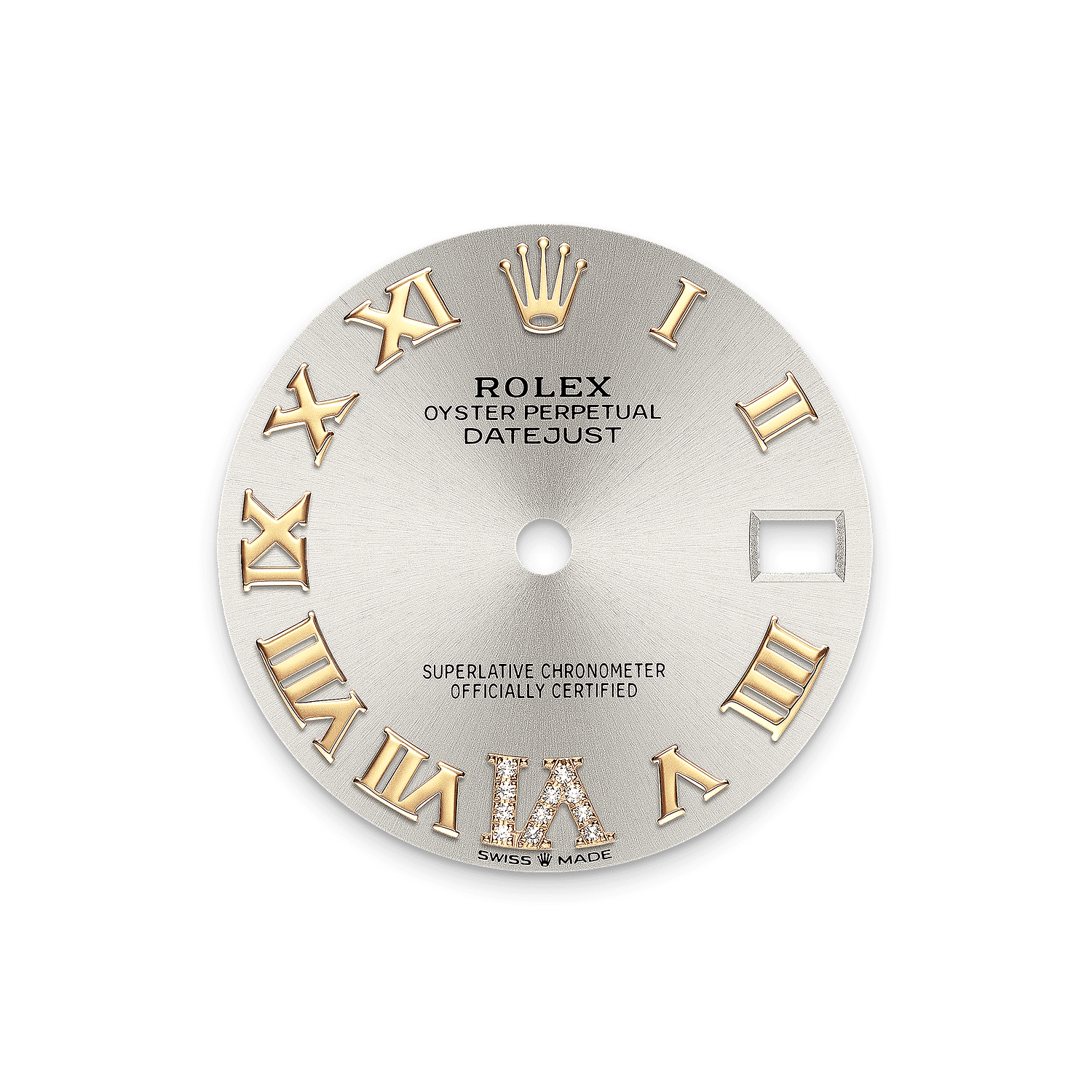 Il quadrante presenta un grande numero VI con 11 diamanti. La finitura soleil crea delicati riflessi di luce su molti quadranti della collezione Oyster Perpetual. Per ottenerla, si fa ricorso a sapienti tecniche di spazzolatura che producono lievi scanalature che si diramano dal centro del quadrante verso l’esterno.