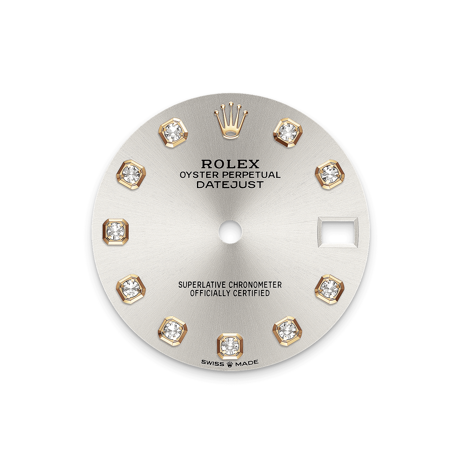 Oyster Perpetual Datejust 31 in acciaio Oystersteel e oro giallo con quadrante argentato con diamanti e bracciale Jubilee.