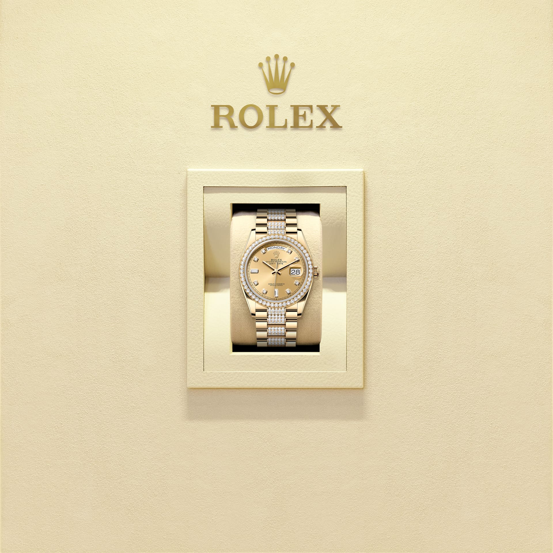Oyster Perpetual Day-Date 36 in oro giallo 18 ct con quadrante color champagne con diamanti, lunetta con diamanti e bracciale President con diamanti.