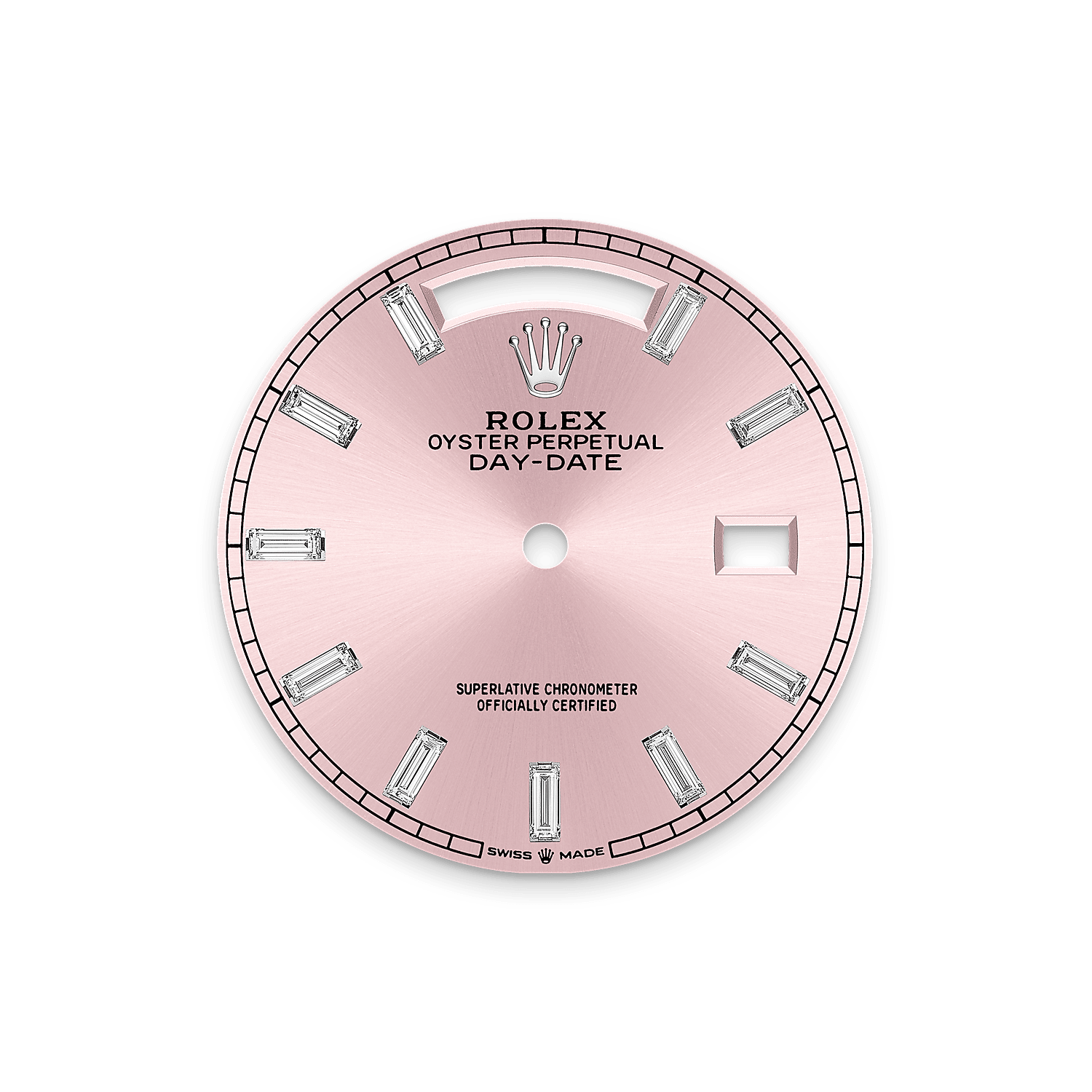 Il quadrante presenta 10 diamanti taglio baguette. La finitura soleil crea delicati riflessi di luce su molti quadranti della collezione Oyster Perpetual. Per ottenerla, si fa ricorso a sapienti tecniche di spazzolatura che producono lievi scanalature che si diramano dal centro del quadrante verso l’esterno.