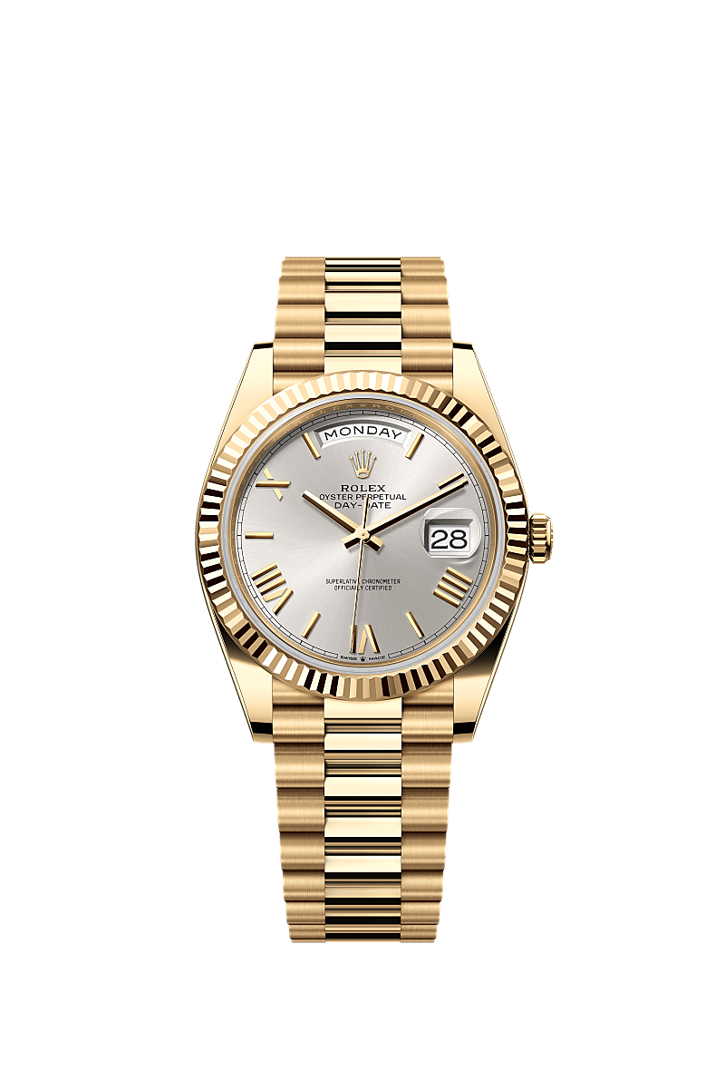 Oyster Perpetual Day-Date 40 in oro giallo 18 ct con quadrante argentato, lunetta zigrinata e bracciale President.