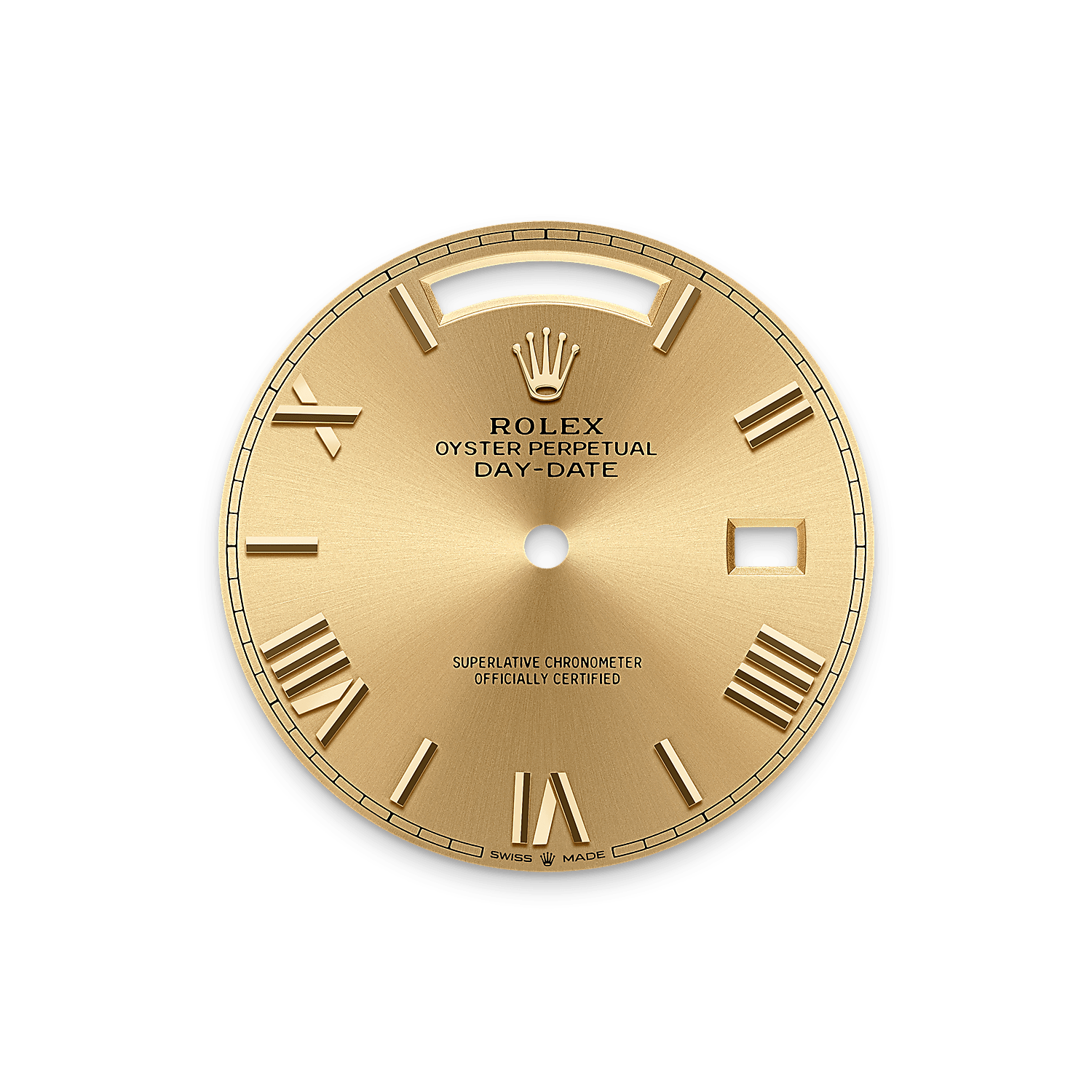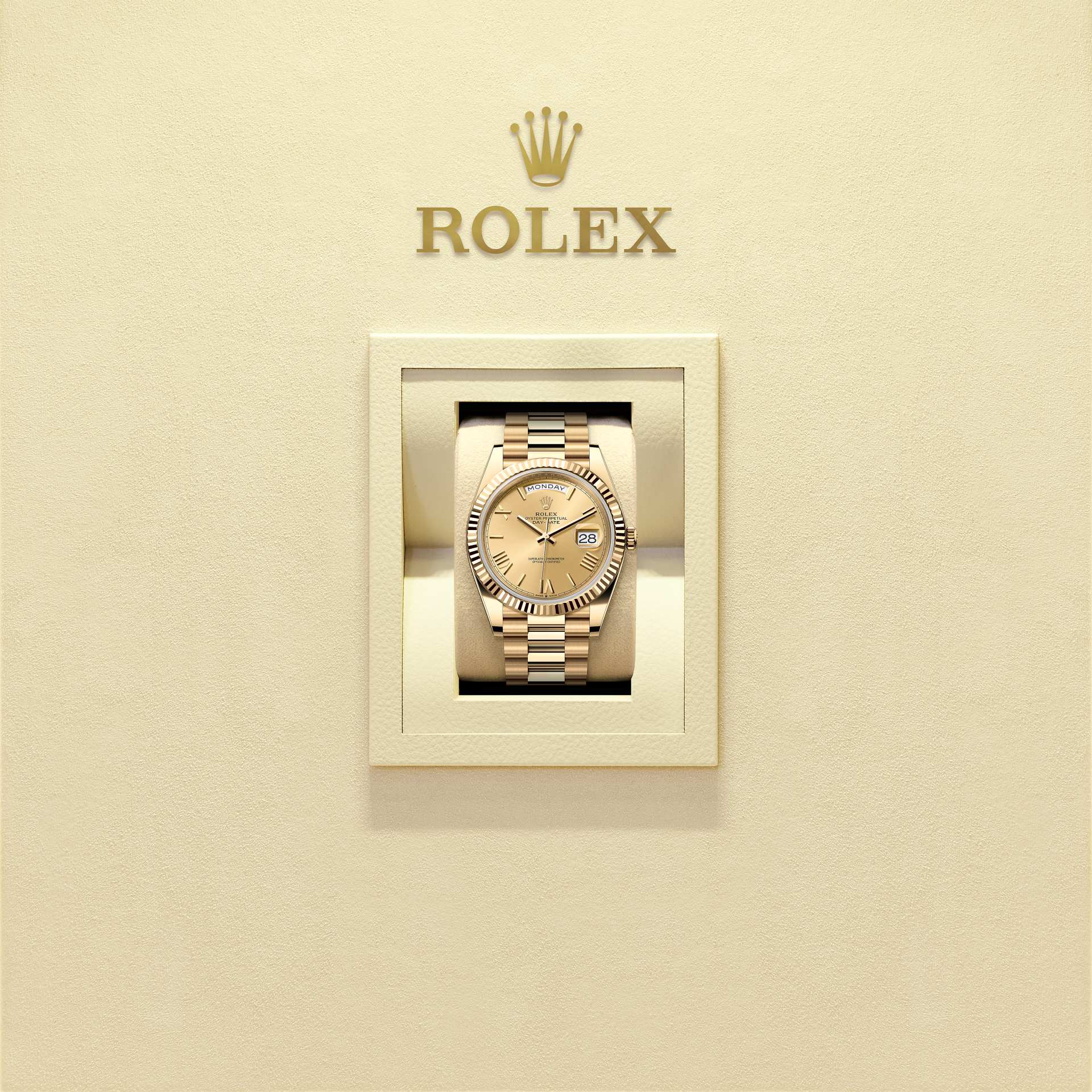 Oyster Perpetual Day-Date 40 in oro giallo 18 ct con quadrante color champagne, lunetta zigrinata e bracciale President.