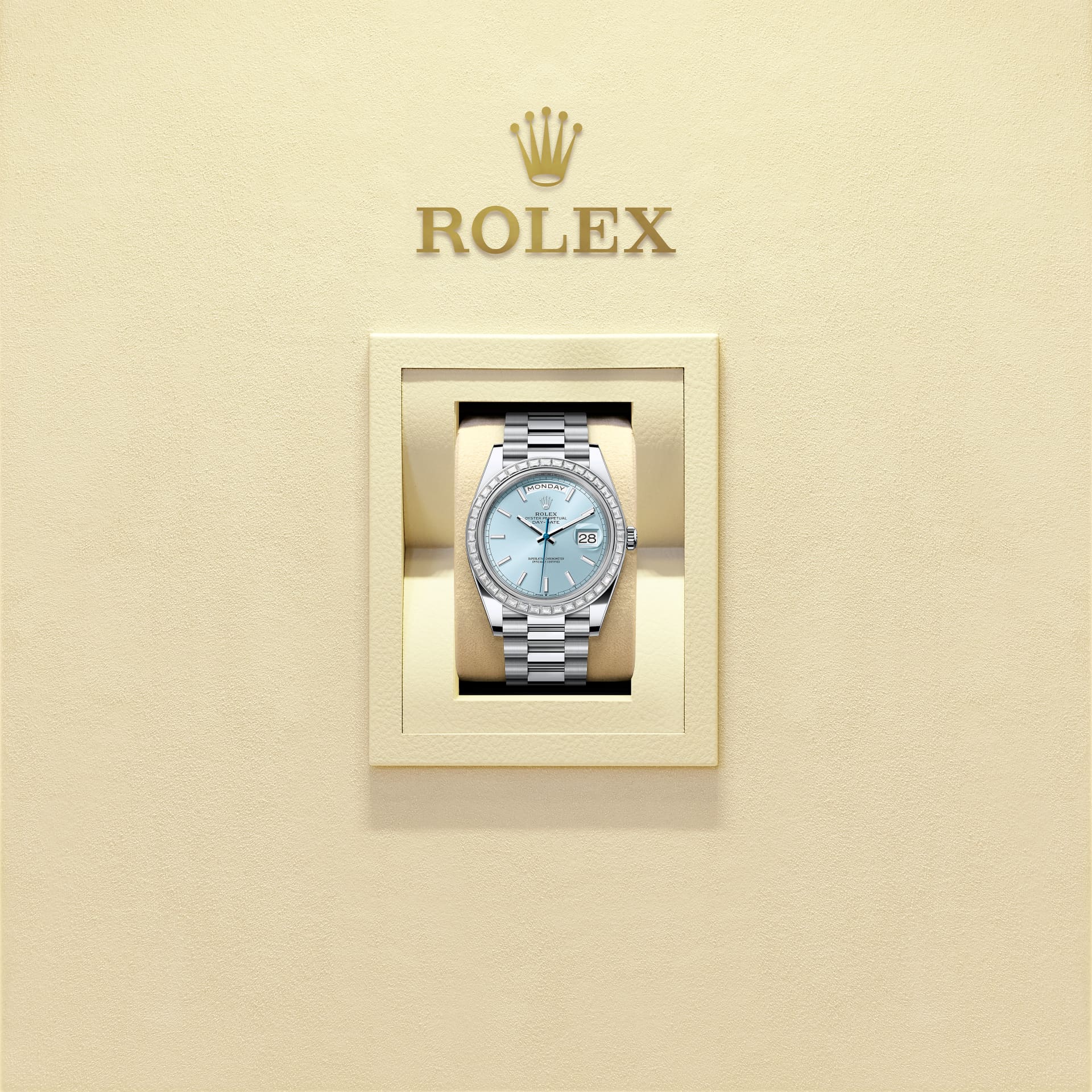 Oyster Perpetual Day-Date 40 in platino con quadrante blu ghiaccio, lunetta con diamanti e bracciale President.