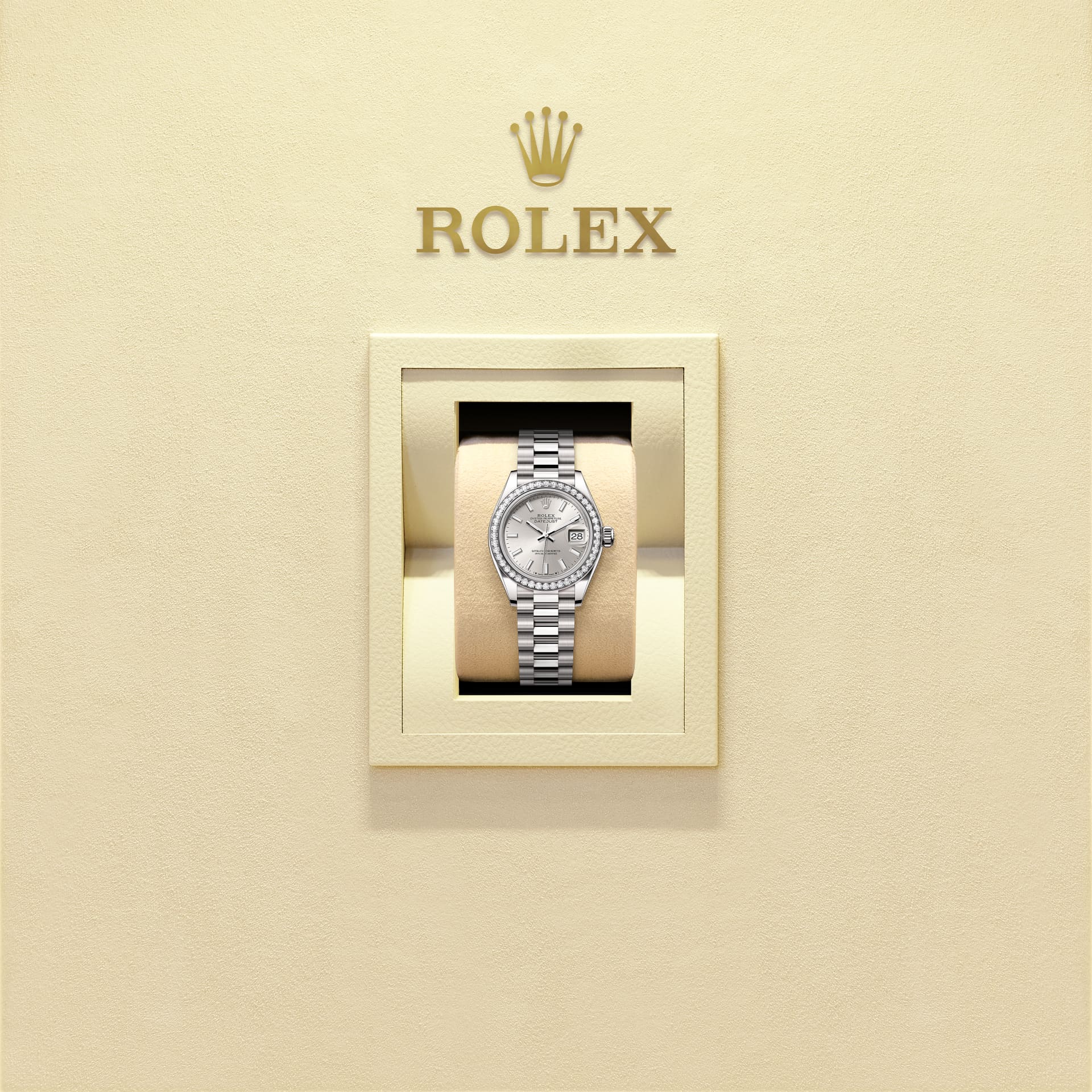 Oyster Perpetual Lady-Datejust in oro bianco 18 ct con quadrante argentato e bracciale President.
