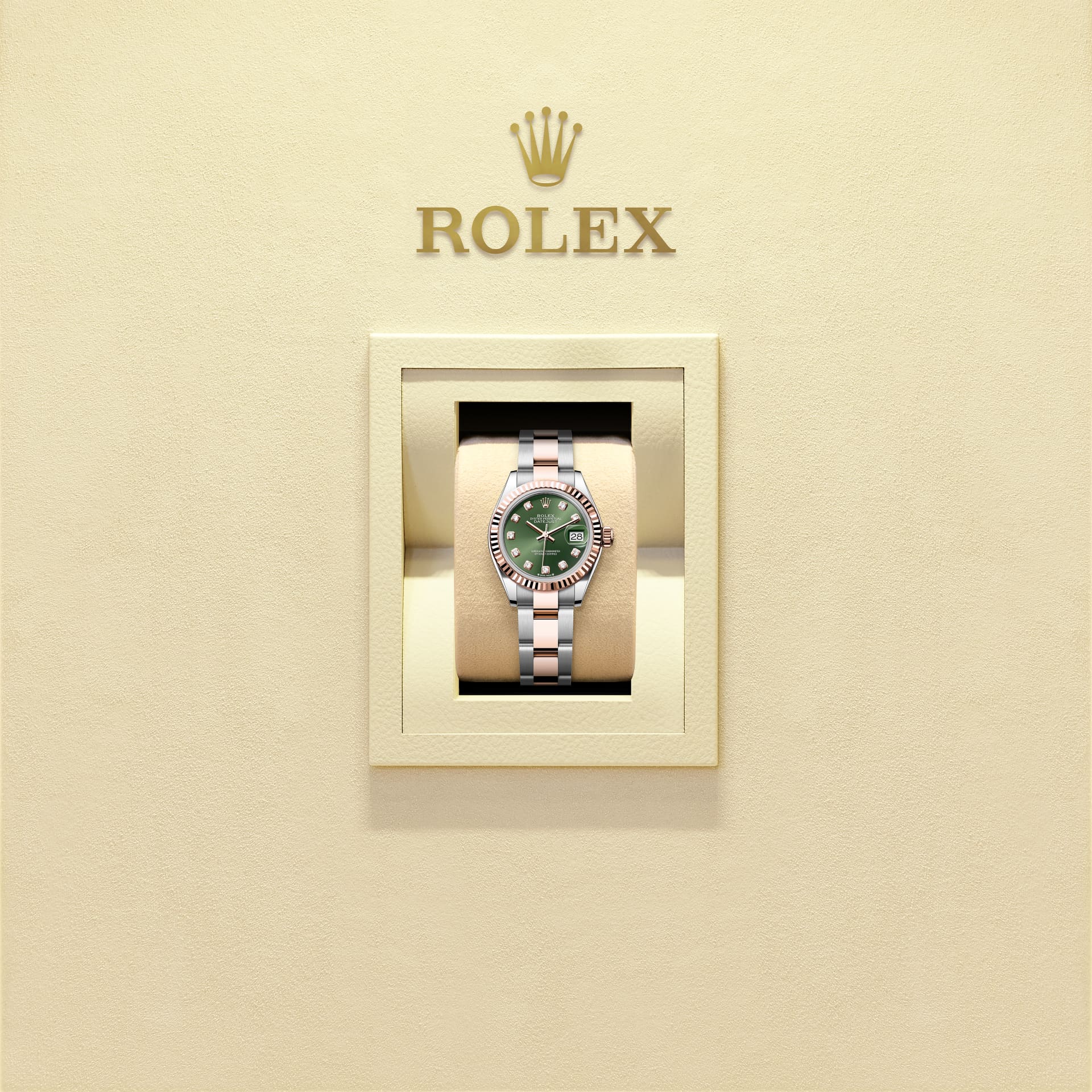 Oyster Perpetual Lady-Datejust in acciaio Oystersteel e oro Everose con quadrante verde oliva con diamanti e bracciale Oyster.