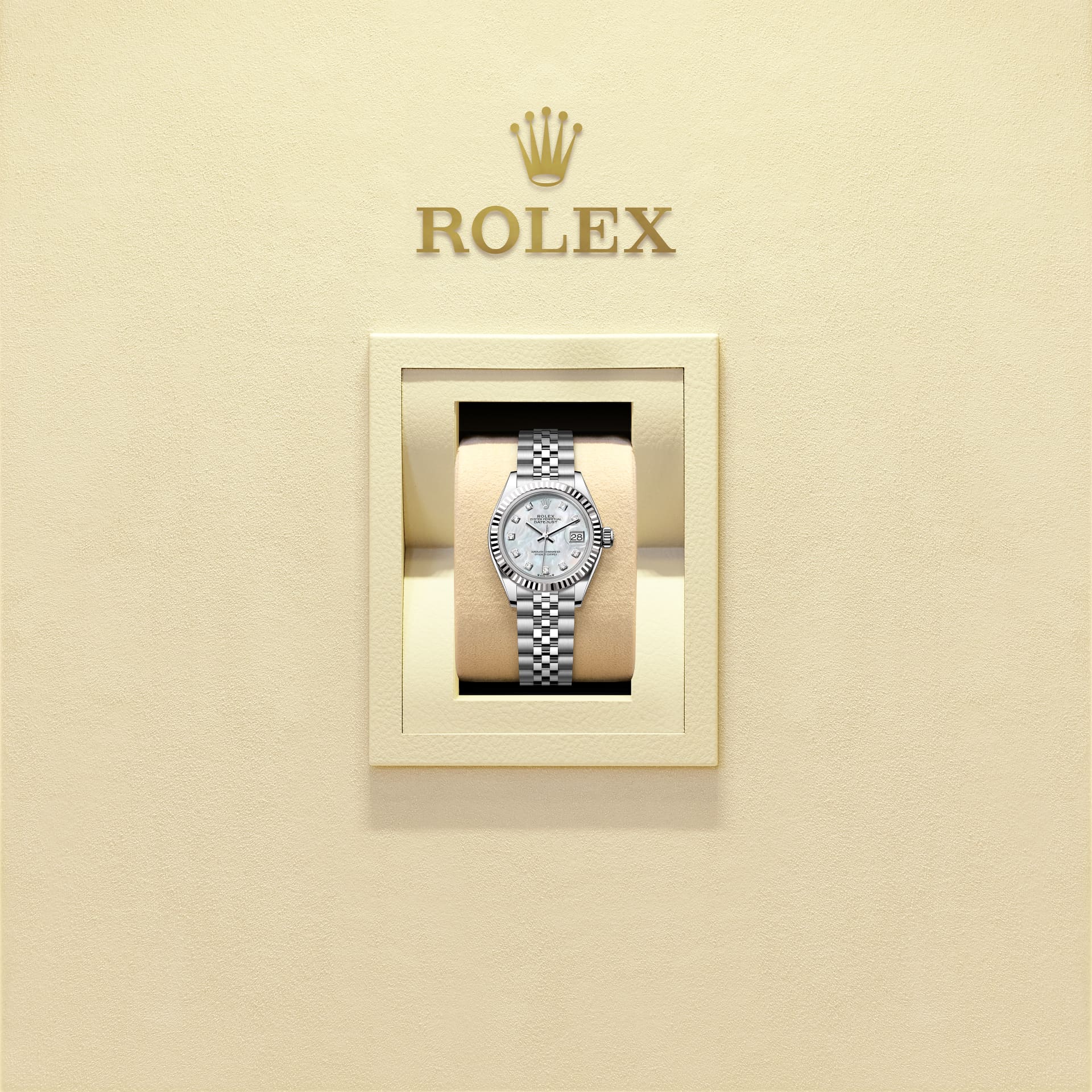 Oyster Perpetual Lady-Datejust in acciaio Oystersteel e oro bianco con quadrante in madreperla bianca con diamanti e bracciale Jubilee.