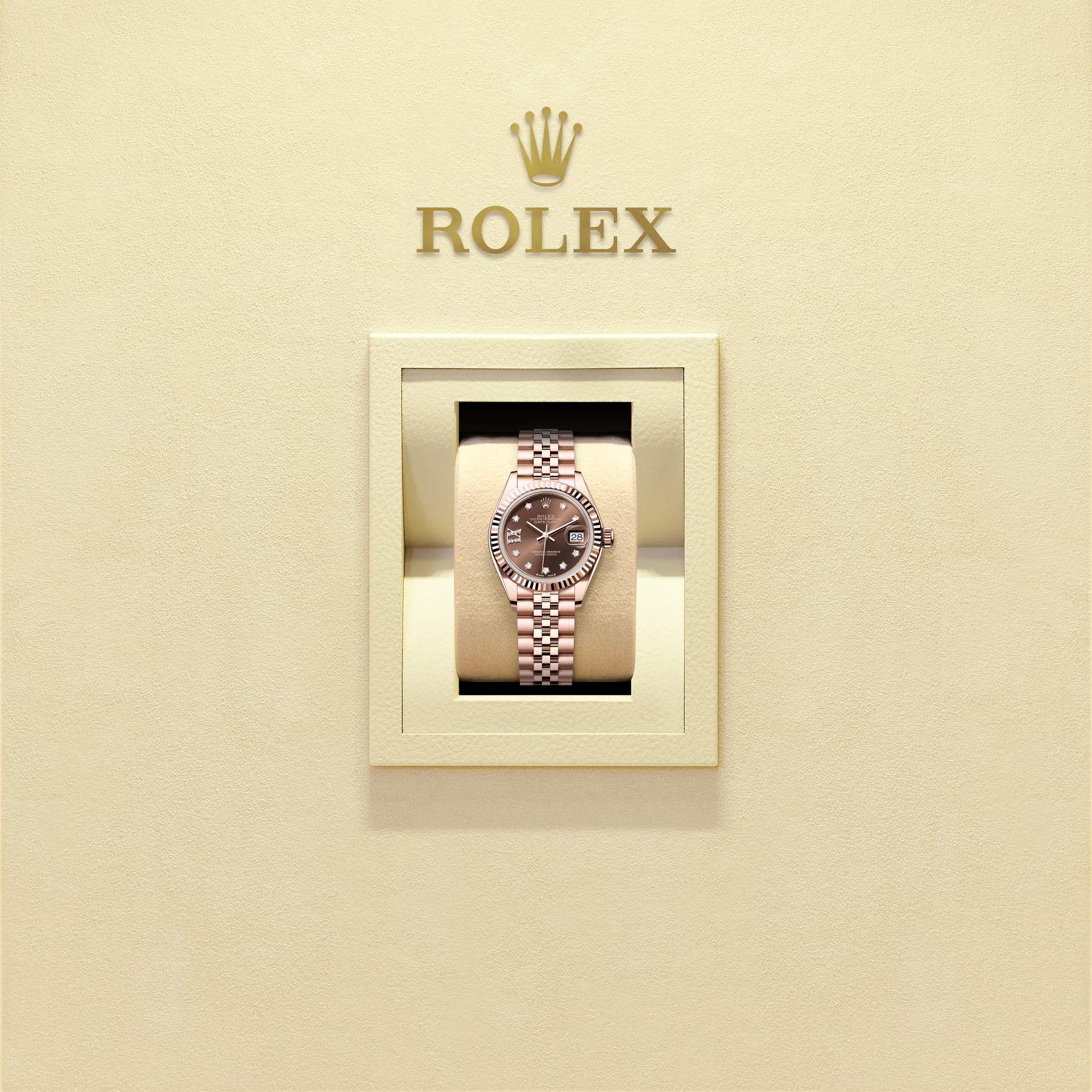 Oyster Perpetual Lady-Datejust in oro Everose 18 ct con quadrante cioccolato con diamanti e bracciale Jubilee.